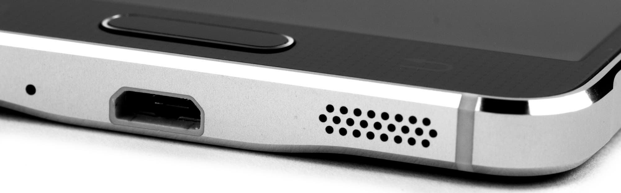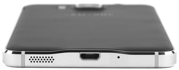Решетка основного динамика здесь выведена не на тыльную сторону, а в нижний торец, что удобно: звук лежащего на столе аппарата не перекрывается поверхностью, как это происходит с Samsung Galaxy Note 4, у которого динамик выведен на заднюю сторону. Рядом со звуковой решеткой можно обнаружить стандартный разъем Micro-USB, поддерживающий подключение внешних устройств через OTG-переходник. Здесь, как и в Galaxy Note 4, используется USB 2.0 — от USB 3.0 в Samsung по какой-то причине решили отказаться.