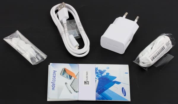 Содержащийся в коробке комплект аксессуаров содержит компактное зарядное устройство (1,55 А, 5 В), соединительный кабель Micro-USB и проводную стереогарнитуру с плоским незапутывающимся проводом-лапшой и гелевыми амбушюрами вкладного типа. Небольшая стопочка бумажной документации традиционно аккуратно перетянута ленточкой.