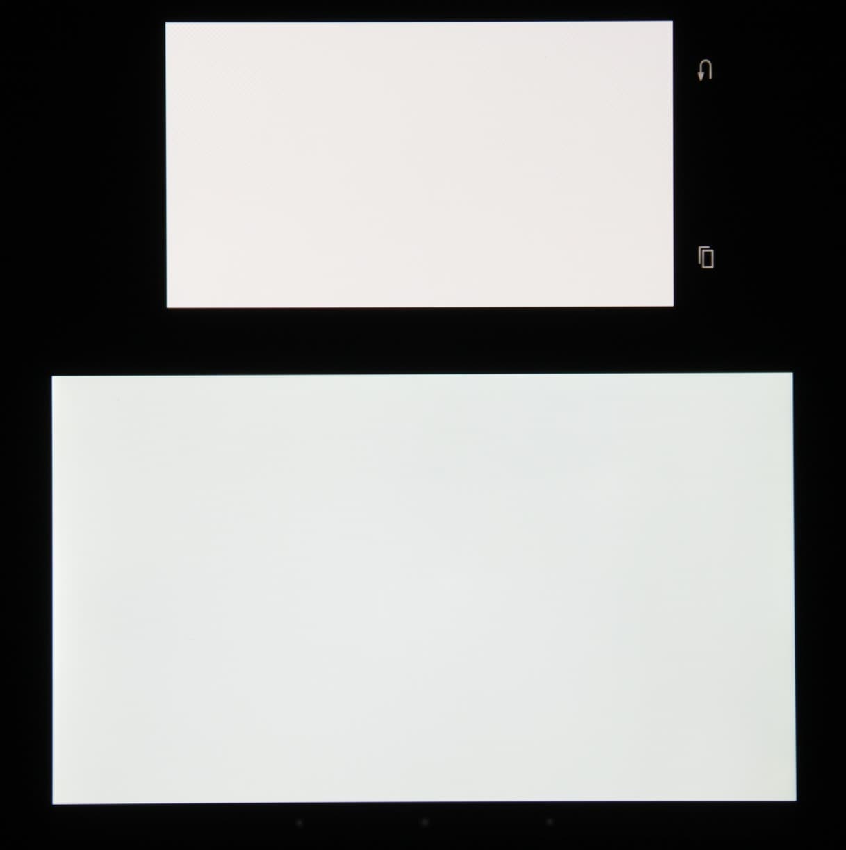 Экран характеризуется великолепными углами обзора, правда белый цвет при отклонении даже на небольшие углы приобретает легкий сине-зеленый оттенок, но черный цвет — просто черный под любыми углами. Настолько черный, что параметр контрастности в данном случае неприменим. При перпендикулярном взгляде равномерность белого поля отличная. Для сравнения приведем фотографии, на которых на экраны Samsung Galaxy Alpha (профиль Основной) и второго участника сравнения выведены одинаковые изображения, при этом яркость экранов изначально установлена примерно на 200 кд/м², а цветовой баланс на фотоаппарате принудительно переключен на 6500 К. Белое поле: