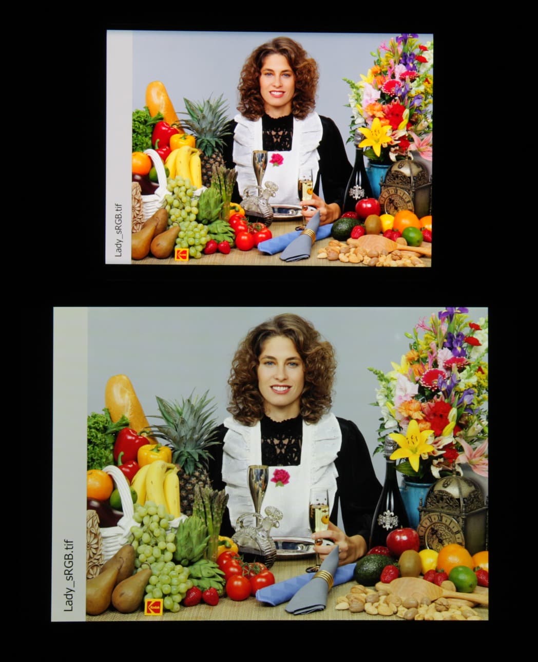 Отметим, что на экранах с широким цветовым охватом (без соответствующей коррекции) цвета́ обычных изображений, оптимизированных для устройств sRGB, выглядят неестественно насыщенными. Отсюда и рекомендация: в большинстве случаев смотреть кино, фотографии и все естественное лучше при выборе профиля Основной, и только если фотография сделана на установке Adobe RGB, имеет смысл переключить профиль на Фото AMOLED. Аналогично, профиль Фильм AMOLED уместен при просмотре видеоматериала с охватом DCI-P3, принятым в цифровом кинематографе.