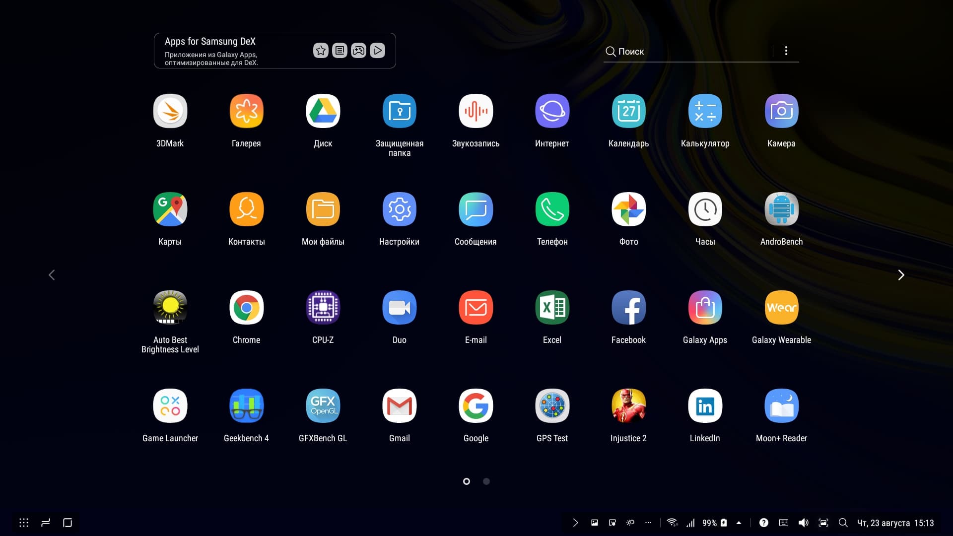 Отметим, что в данном случае для работы в режиме Samsung DeX не обязательно использовать фирменный адаптер. На экран монитора выводится изображение альтернативного рабочего стола, а экран смартфона может использоваться в качестве сенсорной панели координатного ввода или работать как обычно. На рабочем столе DeX могут работать большинство приложений Android.