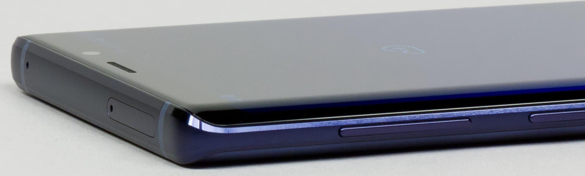 Здесь нам все знакомо: и изящно изгибающаяся металлическая боковая рамка, сужающаяся на боковинах, и практически плоские стеклянные панели с крутыми функциональными закруглениями по бокам. От Galaxy Note 8 и S8 новый смартфон отличается, по сути, лишь более заостренными в плане угловыми частями, которые придают корпусу совсем уж прямоугольный кирпичеобразный вид. С острыми углами корейцы, пожалуй, переборщили, они уже буквально впиваются в ладонь, удерживать смартфон не всегда комфортно.