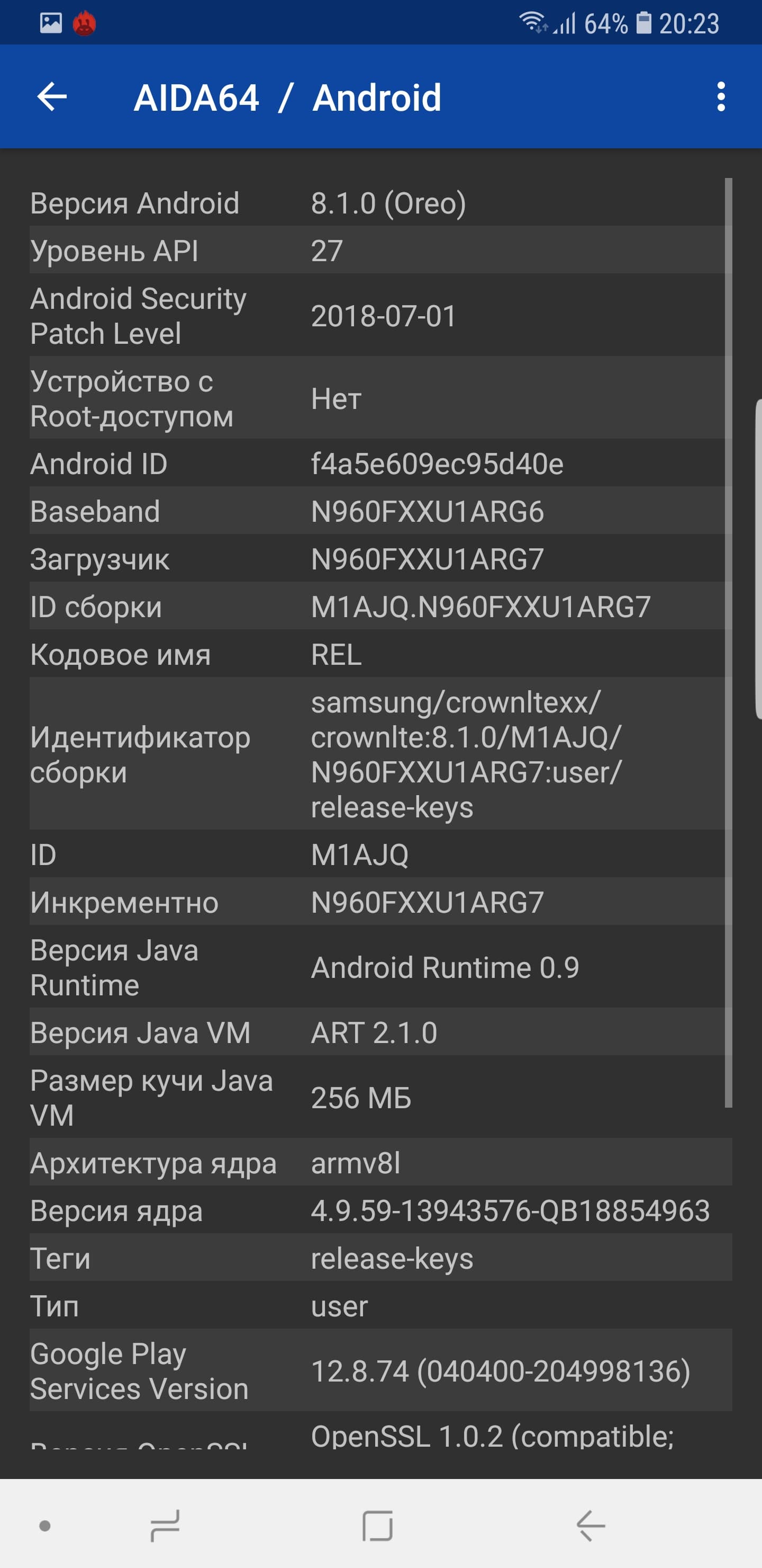 Герой обзора функционирует на однокристальной системе Exynos 9 Series 9810, флагманской мобильной платформе Samsung (в США и в Китае модель выйдет на Snapdragon 845). В конфигурацию этой SoC входит два кластера по четыре процессорных ядра: Exynos M3 (M3 Mongoose) с частотой до 2,7 ГГц и кастомные Cortex-A55 с частотой до 1,8 ГГц. Объем оперативной памяти LPDDR4X составляет 6 или 8 ГБ, объем хранилища — 128 или 512 ГБ. Из 128 ГБ на новом смартфоне свободны около 108 ГБ. Также поддерживается установка карт памяти, которые форматируются только в качестве внешнего хранилища.