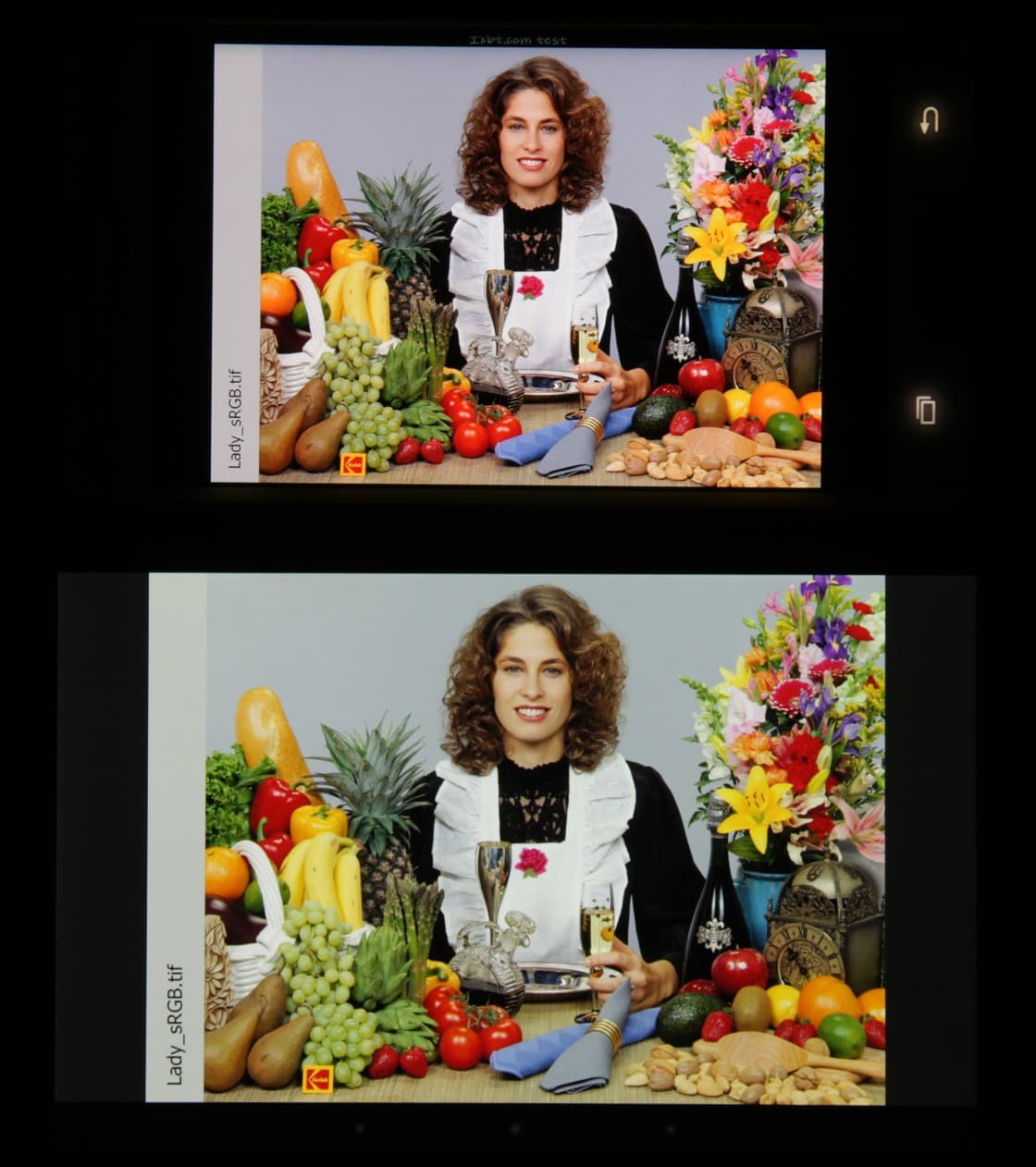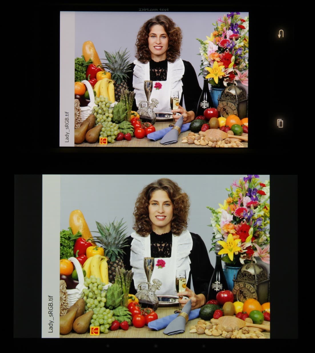 Яркость под углом у обоих экранов заметно уменьшилась (чтобы избежать сильного затемнения, выдержка увеличена в 2,6 раза в сравнении с предыдущими двумя фотографиями), но в случае Samsung падение яркости выражено гораздо меньше (затемнение на загибе можно не учитывать). В итоге при формально одинаковой яркости экран Galaxy Note Edge визуально выглядит гораздо более ярким (в сравнении с ЖК-экранами), так как на экран мобильного устройства часто приходится смотреть как минимум под небольшим углом. И тестовая картинка: