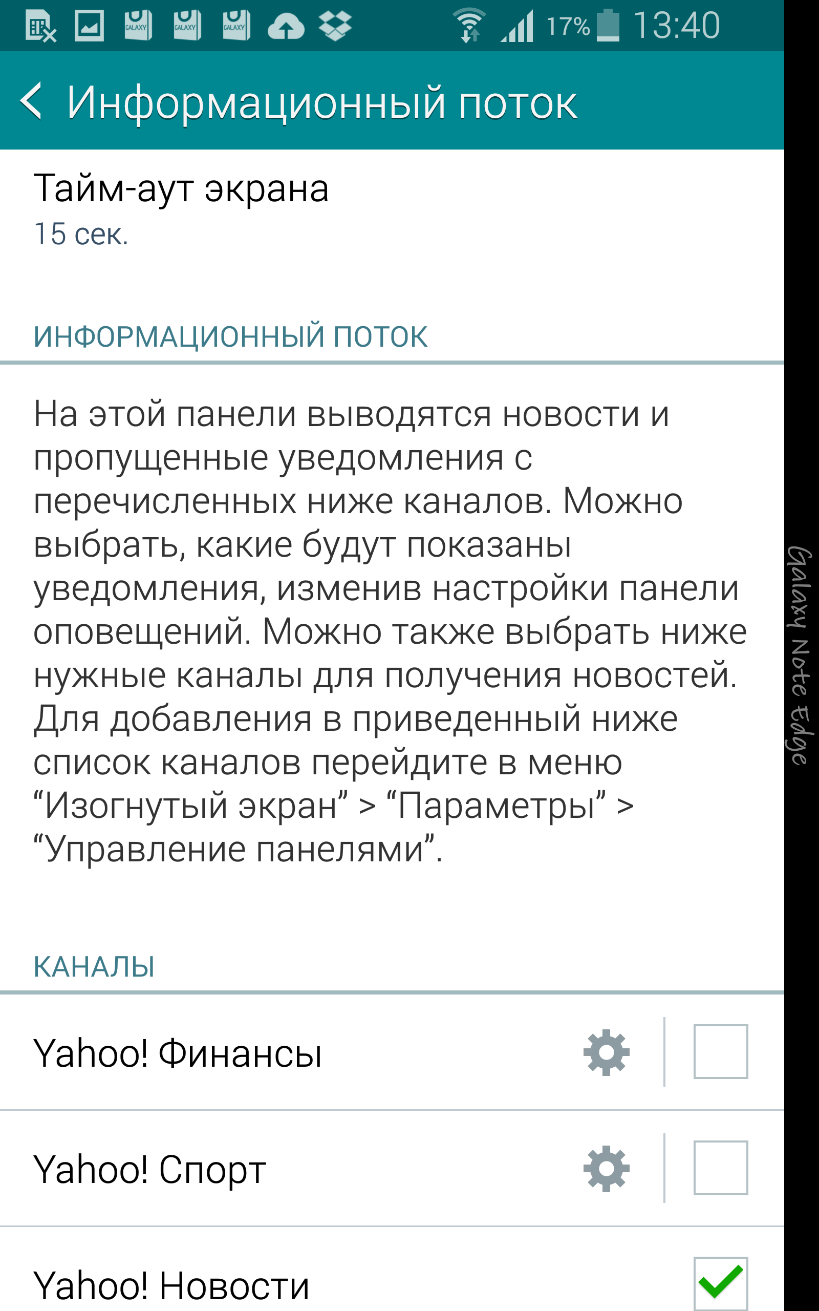 Цветопередача хорошая, однако цветовой баланс у экранов немного различается, и цвета у Galaxy Note Edge чуть более насыщенные (по крайней мере, так изображение регистрируется фотоаппаратом). Заметим, что в данном случае картинка занимает в высоту (при этой ориентации экрана) всю доступную для вывода изображения область и уже заходит на загнутый край экрана, что приводит к затемнению и некоторому искажению цвета. Также на свету эта область почти всегда бликует, что еще больше мешает при просмотре изображений, выведенных на весь экран. Хорошо хоть картинка фильмов с соотношением сторон 16:9 не заходит на загиб, но в формате вывода на весь экран указанная особенность проявляется и в этом случае. Фотография выше получена после выбора профиля Основной в настройках экрана, всего их четыре: