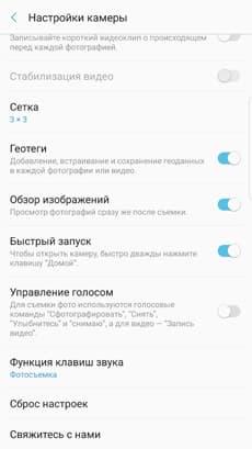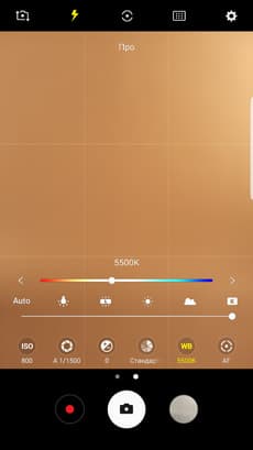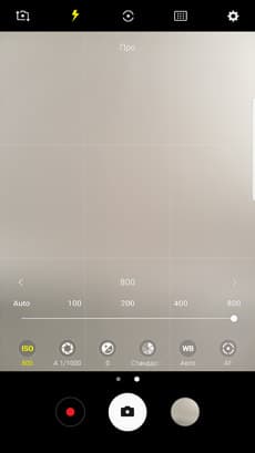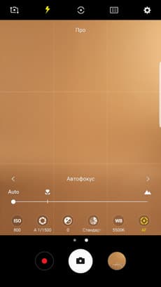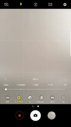 | В дополнительных настройках камеры можно изменить сетку кадра, включить просмотр фотографий после съемки и даже голосовое управление камерой. | Так можно установить параметры съемки в режиме «Про». Верхняя строка позволяет выбрать тип экспозамера и тип автофокуса. | Вручную выдержка меняется в пределах 1 — 1/24000 секунды. |