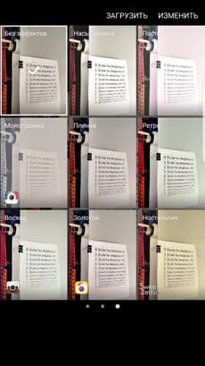 | В автоматическом режиме мы можем: переключать основную и фронтальную камеры; включать/выключать режим HDR; управлять вспышкой; производить общие настройки. | Еще мы можем перейти на экран справа и быстро выбрать накладываемый эффект — «Ретро», «Монохром», «Ностальгия» и др. | Экран слева позволяет переключиться из режима «Авто» в восемь других режимов. Среди них можно отдельно отметить: «Про», «Виртуальную съемку» и «Гиперлапс». |