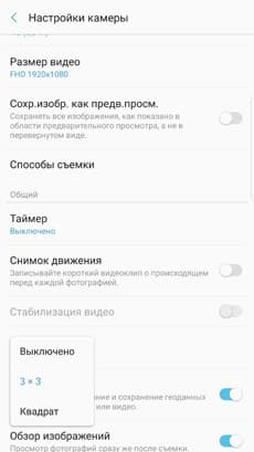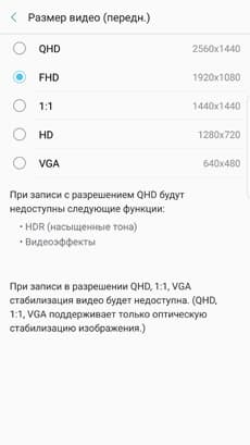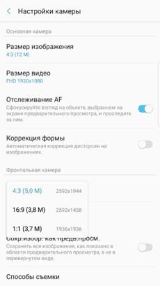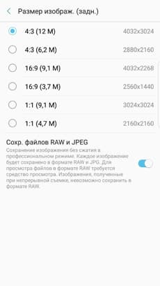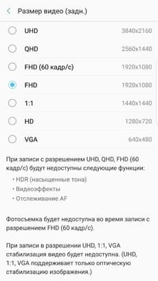 | Это первый экран настроек камеры. Особых комментариев не требует — все написано русским по белому. | По умолчанию камера снимает в формате 4:3, максимальное разрешение — 12 Мп. Кроме того, можно выбрать форматы 16:9 и 1:1 — разумеется, с понижением разрешения. | Установки при выборе формата видео также понятны. Samsung честно предупреждает, что при съемке видео 4K или Full HD с 60 fps нам будут недоступны HDR и наложение эффектов, а автофокус будет зафиксирован по первому кадру. |