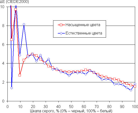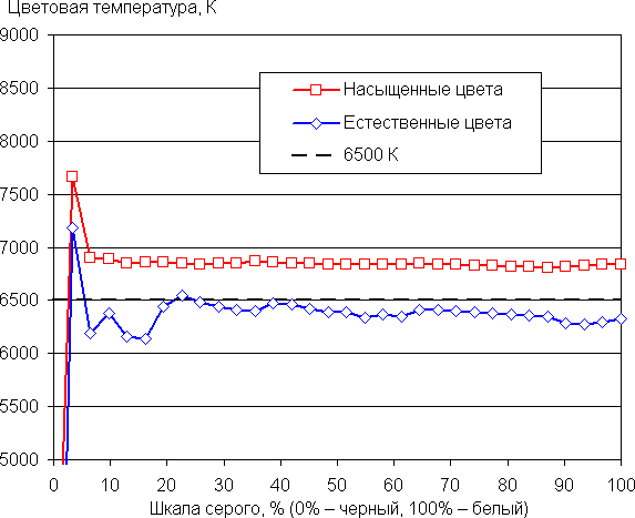 Баланс оттенков на шкале серого приемлемый. Цветовая температура после выбора профиля Естественные цвета близка к 6500 К, при этом на значимом участке шкалы серого этот параметр изменяется не очень сильно, что улучшает визуальное восприятие баланса цветов. Отклонение от спектра абсолютно черного тела (ΔE) на большей части шкалы серого остается ниже 10 единиц, что для потребительского устройства считается хорошим показателем: