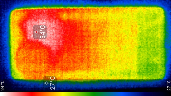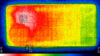 Нагрев выше в верхней левой части аппарата, что, видимо, соответствует расположению микросхемы SoC. По данным теплокамеры, максимальный нагрев составил всего 34 градуса (при температуре окружающего воздуха в 24 градуса), это относительно немного.