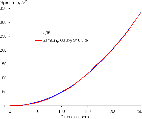 Напомним, что в случае OLED-экранов яркость фрагментов изображения динамично меняется в соответствии с характером выводимого изображения — уменьшается для светлых в целом изображений. В итоге полученная зависимость яркости от оттенка (гамма-кривая), скорее всего, немного не соответствует гамма-кривой статичного изображения, так как измерения проводились при последовательном выводе оттенков серого почти на весь экран.