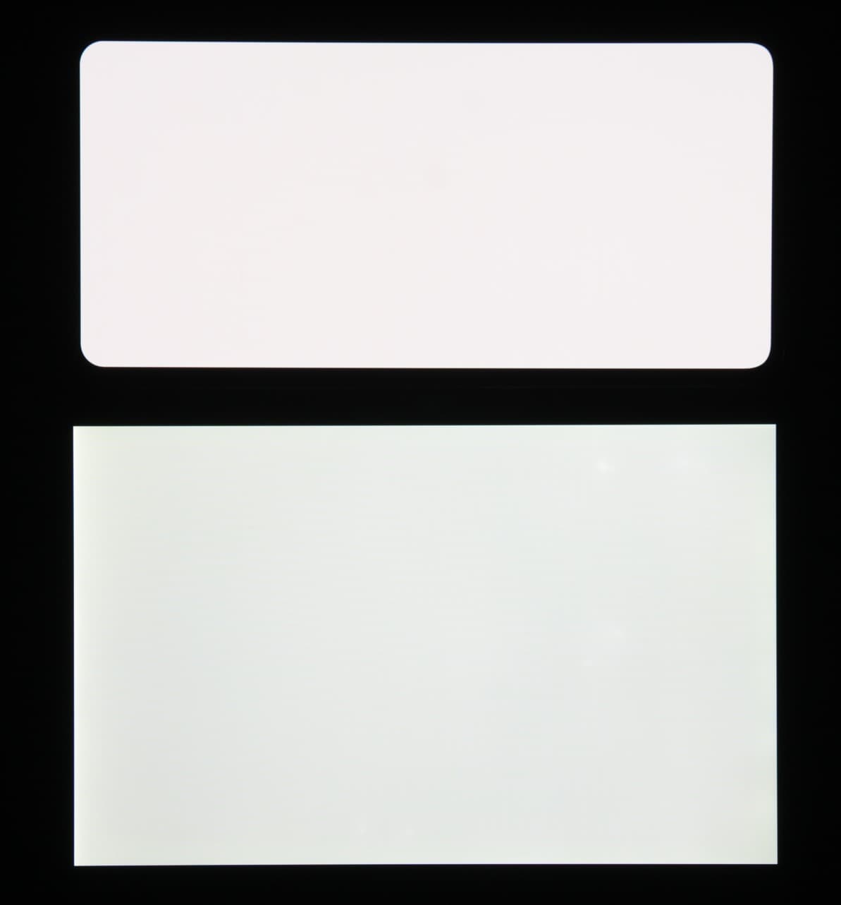 Экран характеризуется великолепными углами обзора. Правда, белый цвет при отклонении даже на небольшие углы приобретает поочередно легкий сине-зеленый или розоватый оттенок, но черный цвет остается просто черным под любыми углами. Он настолько черный, что параметр контрастности в данном случае неприменим. Для сравнения приведем фотографии, на которых на экраны Samsung Galaxy S10 Lite и второго участника сравнения выведены одинаковые изображения, при этом яркость экранов по белому полю изначально установлена примерно на 200 кд/м², а цветовой баланс на фотоаппарате принудительно переключен на 6500 К.