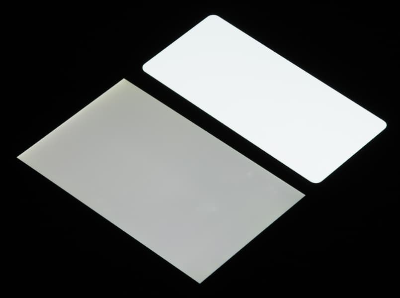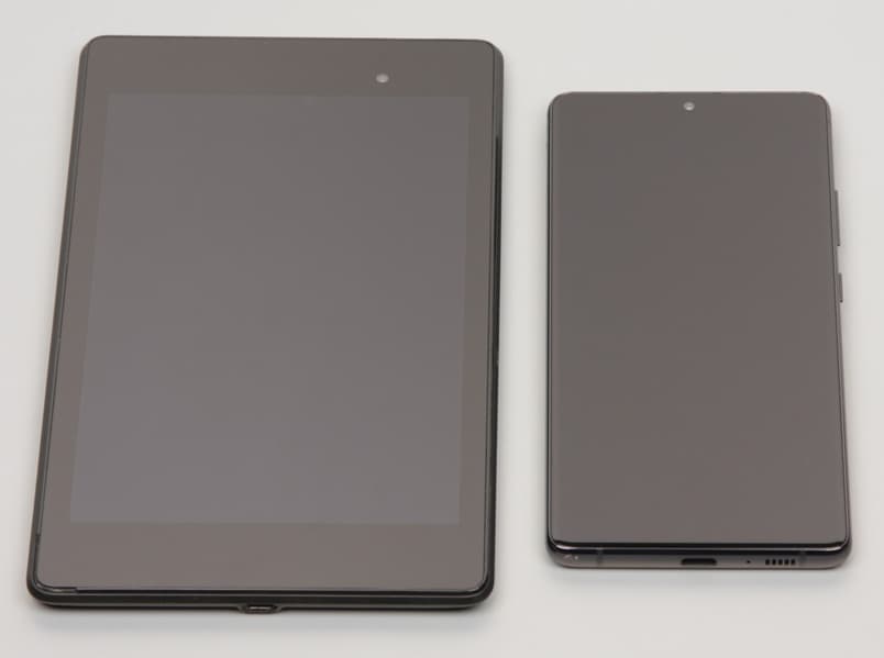 Лицевая поверхность экрана выполнена в виде стеклянной пластины с зеркально-гладкой поверхностью, устойчивой к появлению царапин. Судя по отражению объектов, антибликовые свойства экрана лучше, чем у экрана Google Nexus 7 (2013) (далее просто Nexus 7). Для наглядности приведем фотографию, на которой в выключенных экранах отражается белая поверхность (слева — Nexus 7, справа — Samsung Galaxy S10 Lite, далее их можно различать по размеру):