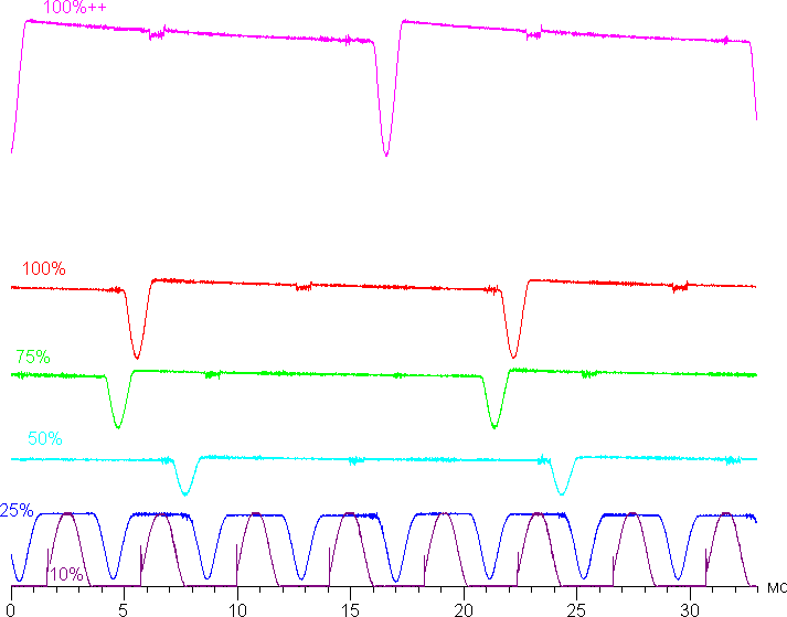 На любом уровне яркости присутствует значимая модуляция с частотой 60 или 240 Гц. На рисунке ниже приведены зависимости яркости (вертикальная ось) от времени (горизонтальная ось) для нескольких значений настройки яркости: