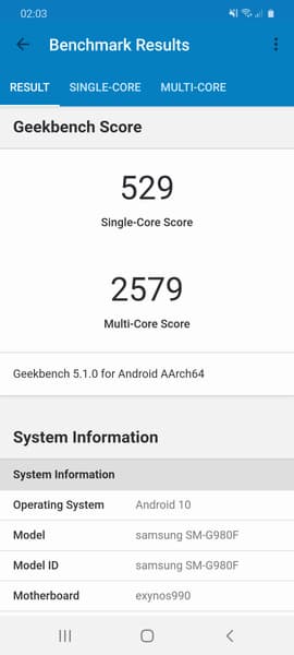Компания Samsung выпустила две версии смартфона, и европейская, которая побывала у нас на тестировании, работает на восьмиядерной однокристальной системе Exynos 990 (2×Mongoose M5 @2,73 ГГц + 2×Cortex-A76 @2,50 ГГц + 4×Cortex-A55 @2,0 ГГц), изготовленной по 7-нанометровому техпроцессу. Роль графического процессора выполняет GPU Mali-G77 MP11. Для рынка США и некоторых других предусмотрена модификация на основе SoC Qualcomm Snapdragon 865 c видеоадаптером Adreno 650.