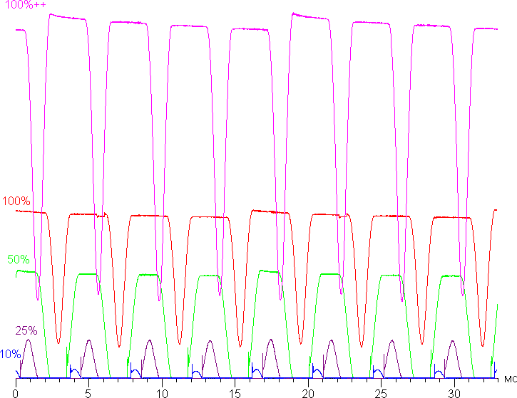 Видно, что амплитуда модуляции в этом режиме достигает 100% на любом уровне яркости, но принципиальных отличий от режима с частотой обновления 60 Гц нет.