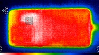 Нагрев немного выше в верхней части левее центра, что, видимо, соответствует расположению микросхемы SoC, но вообще температура крышки почти одинаковая по всей поверхности, то есть явно используется какой-то радиатор. По данным теплокамеры, максимальный нагрев составил 35 градусов (при температуре окружающего воздуха в 24 градуса), это относительно немного.