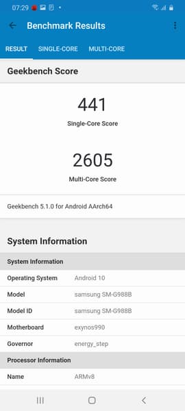 Как обычно, Samsung выпустила две версии смартфона, и европейская, которая побывала у нас на тестировании, работает на восьмиядерной однокристальной системе Exynos 990 (2×Mongoose M5 @2,73 ГГц + 2×Cortex-A76 @2,50 ГГц + 4×Cortex-A55 @2,0 ГГц), изготовленной по 7-нанометровому техпроцессу. Роль графического процессора выполняет GPU Mali-G77 MP11. Для рынка США и некоторых других предусмотрена иная модификация с аппаратной начинкой в виде SoC Qualcomm Snapdragon 865 c видеоадаптером Adreno 650.