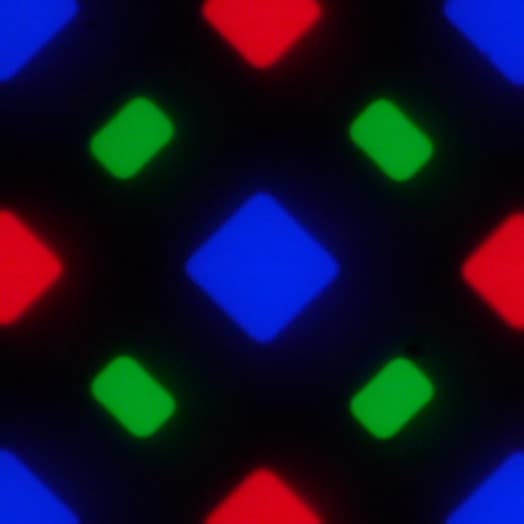 На фрагменте выше можно насчитать 4 зеленых субпикселя, 2 красных (4 половинки) и 2 синих (1 целый и 4 четвертушки), при этом, повторяя эти фрагменты, можно выложить весь экран без разрывов и перехлеста. Для таких матриц компания Samsung ввела наименование PenTile RGBG. Разрешение экрана производитель считает по зеленым субпикселям, по двум другим оно будет в два раза ниже. Присутствуют некоторая неровность контрастных границ и другие артефакты, но из-за очень высокого разрешения они лишь минимально сказываются на качестве изображения.