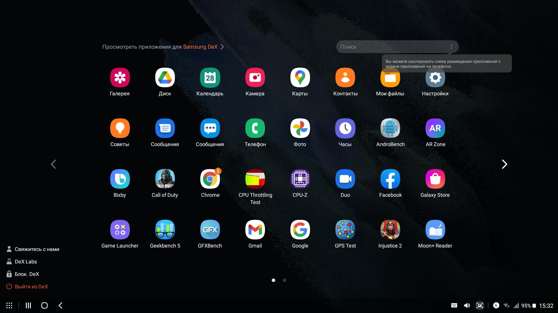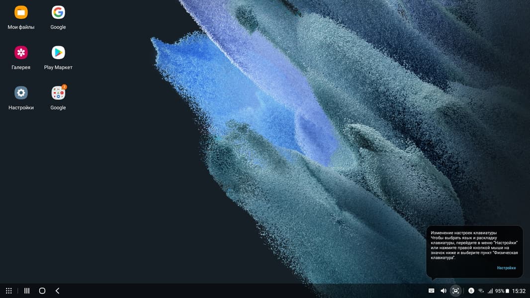 Оптимизированные для Samsung DeX приложения можно установить из фирменного магазина. Управляющая панель в нижней части экрана убирается при выводе изображения на весь экран (например, при воспроизведении видео). Вывод на монитор осуществляется в истинном разрешении 1920 на 1080 пикселей и точка в точку с кадровой частотой 60 Гц. Отметим, что одновременно с выводом изображения и звука можно по USB или по Bluetooth подключать к смартфону мышь и клавиатуру, превращая его в основу для рабочего места. Кроме того, читаются подключенные к адаптеру USB-накопители. Для физической клавиатуры поддерживаются переключение языка и ряд горячих сочетаний клавиш. Поддерживается также подключение к проводной сети на скорости 1 Гбит/с.