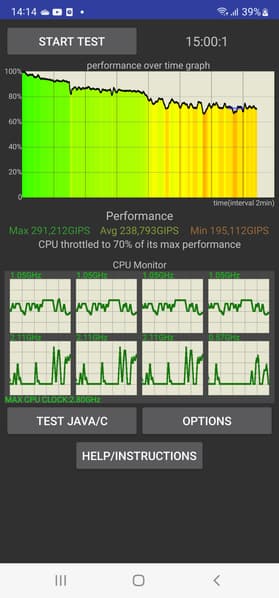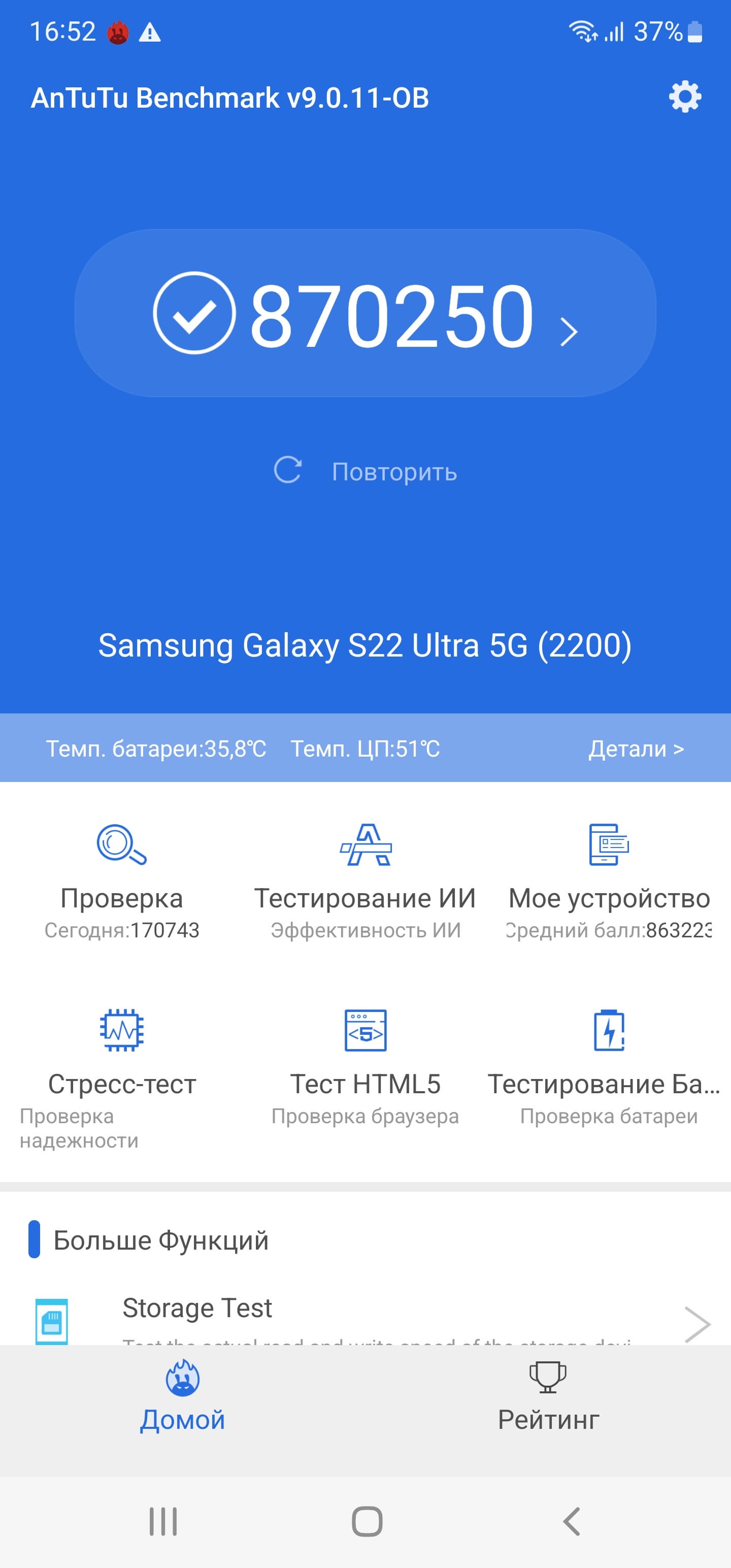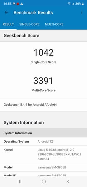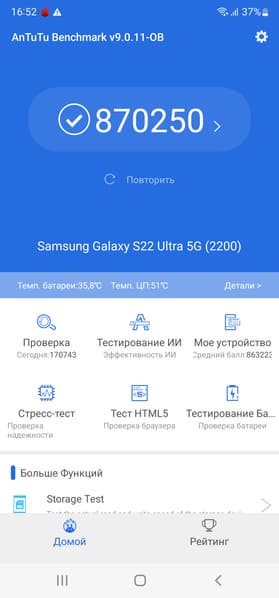 SoC Exynos 2200 производится по техпроцессу 4 нм. Смартфон демонстрирует высочайшие результаты в синтетических тестах, выше, чем у Qualcomm Snapdragon 888. Соответственно, и в реальной эксплуатации недостатка в производительности пользователь не ощутит. Анимации интерфейса плавные, приложения открываются без задержек, игры идут без видимых притормаживаний на высоких настройках графики.