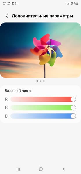 Почему-то только при выборе профиля Насыщенные цвета появляется возможность настройки цветового баланса регулировкой цветовой температуры и тремя регулировками интенсивности основных цветов, но из-за слишком широкого цветового охвата как раз в этом профиле нет смысла исправлять именно баланс.