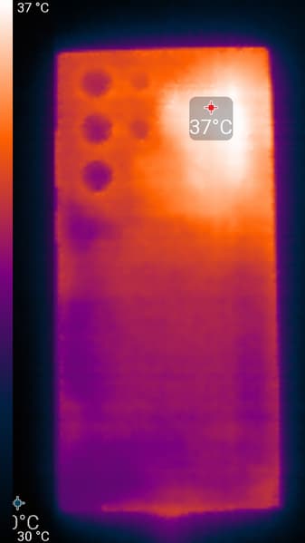 Нагрев выше в верхней части и левее центра, что, видимо, соответствует расположению микросхемы SoC. По данным теплокамеры, максимальный нагрев составил 38 градусов (при температуре окружающего воздуха в 24 градуса), это не очень много.