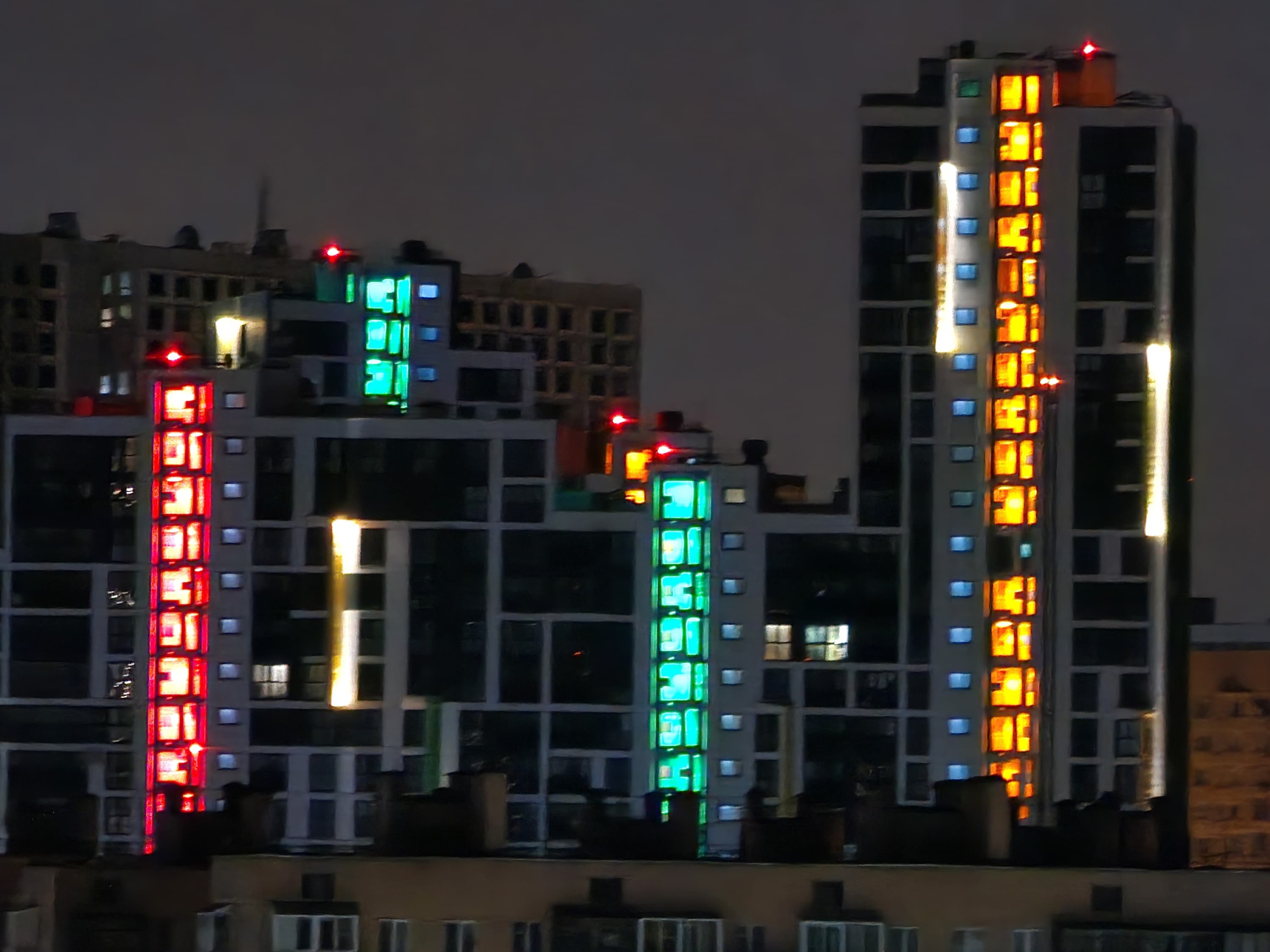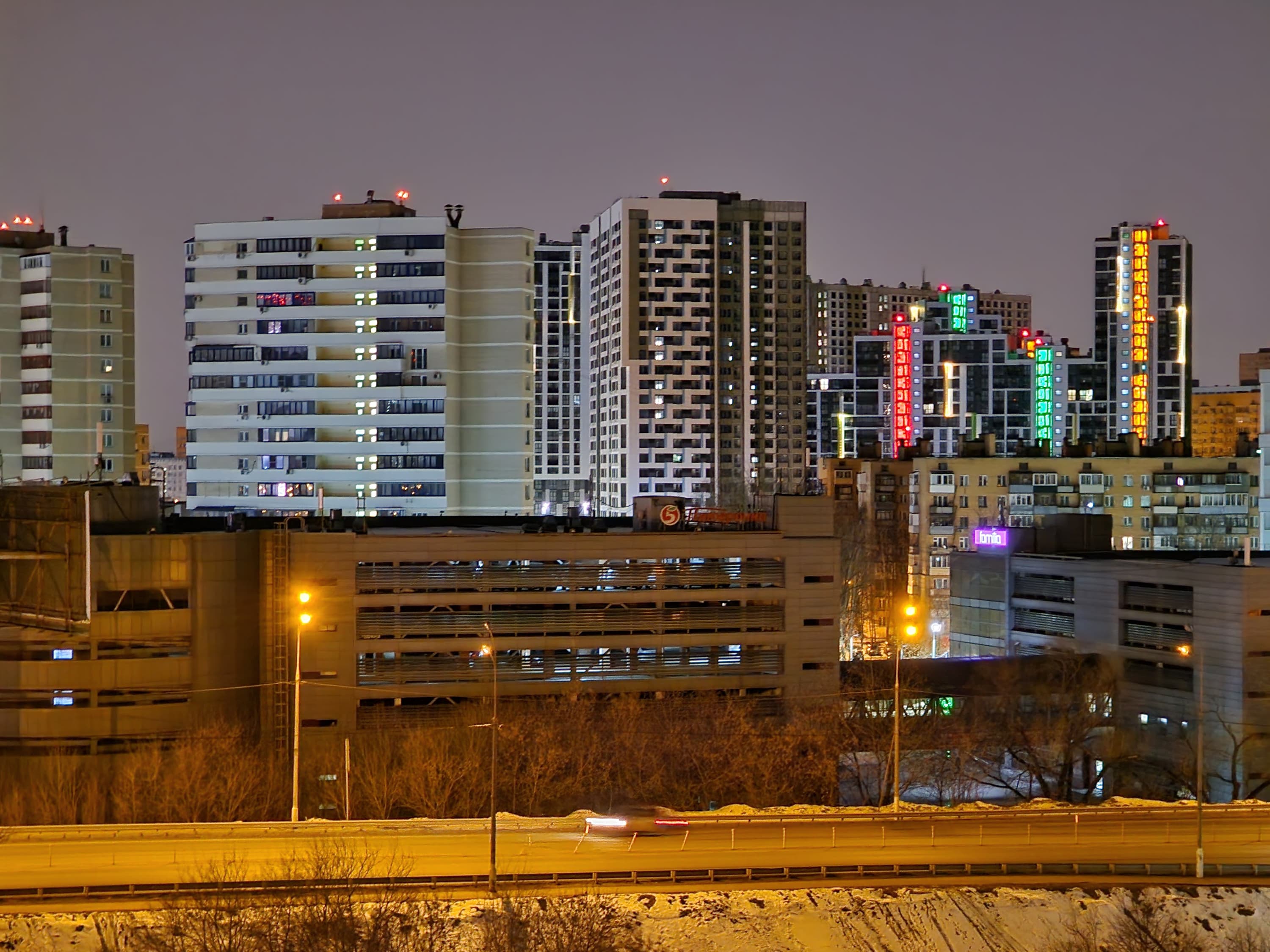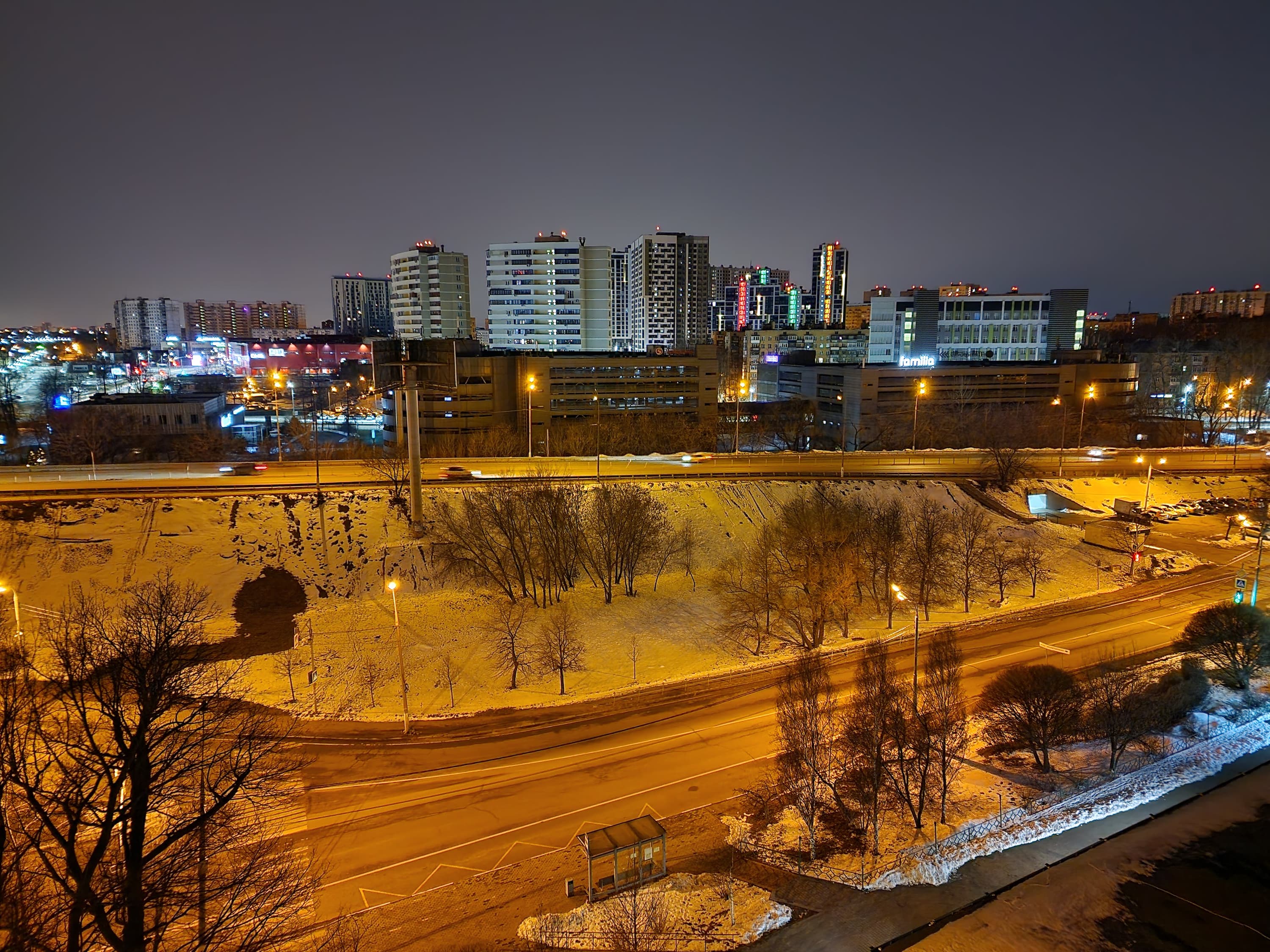 В ночном режиме доступны все те же фокусные расстояния. Качество относительно хорошее: найден баланс между подавлением шумов и уровнем добавленной резкости. Снимки выглядят четкими, но не «дорисованными», к тому же экспозиция не задирается искусственно настолько, чтобы ночной пейзаж стал выглядеть дневным. Источники света не бликуют, оптика качественная.