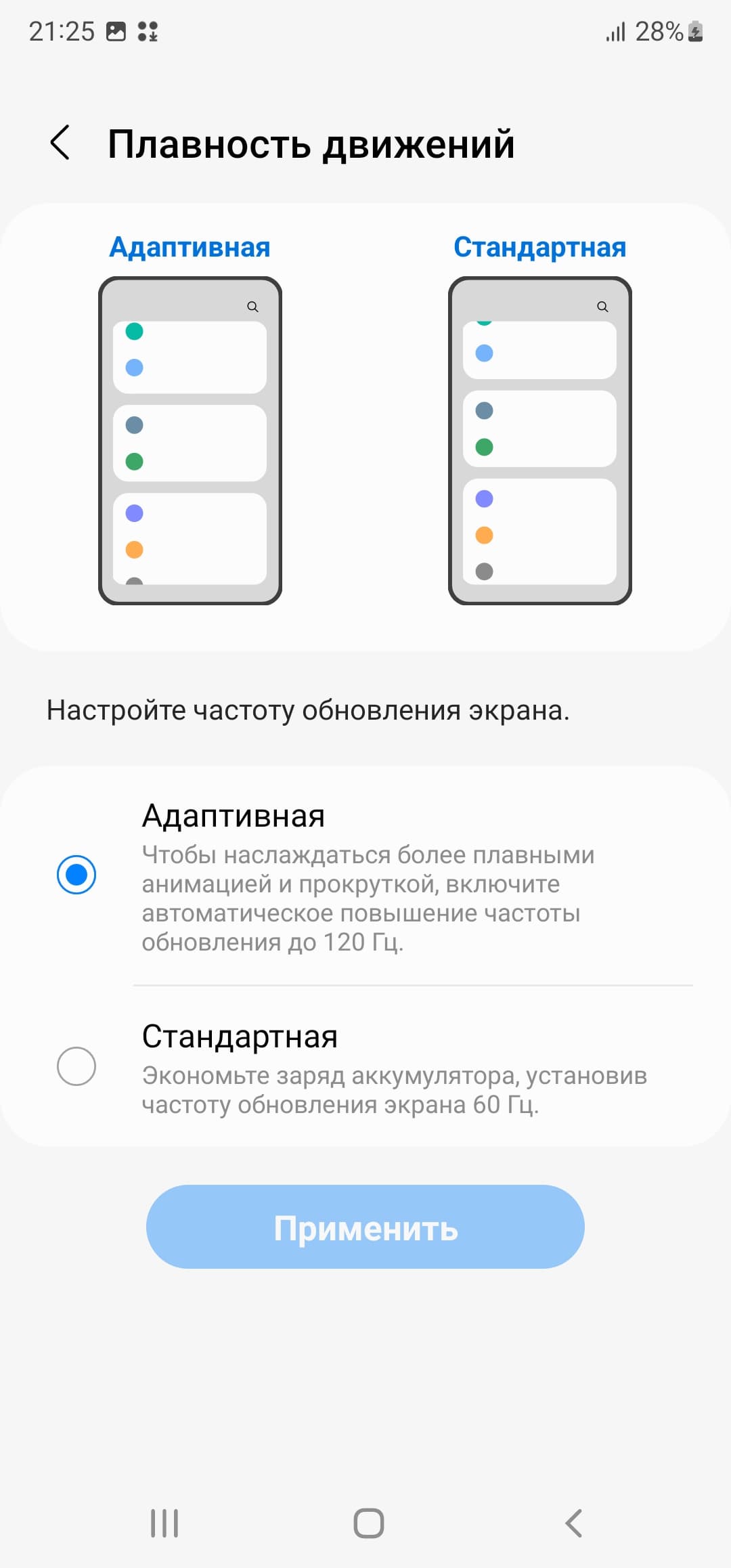 В настройках экрана можно включить режим с повышенной до 120 Гц частотой обновления. В этом режиме нам как минимум обещают увеличение плавности прокрутки.