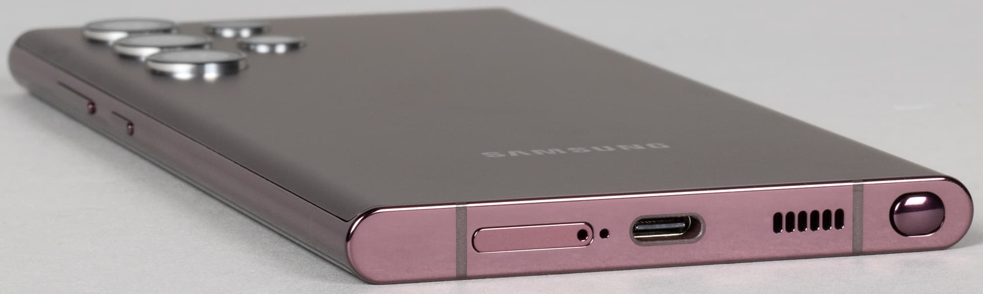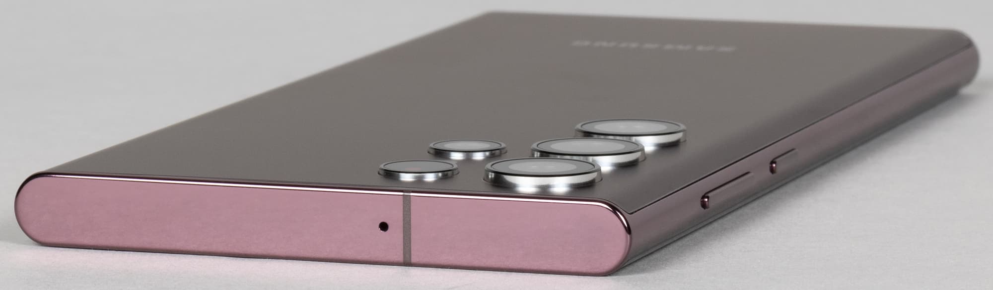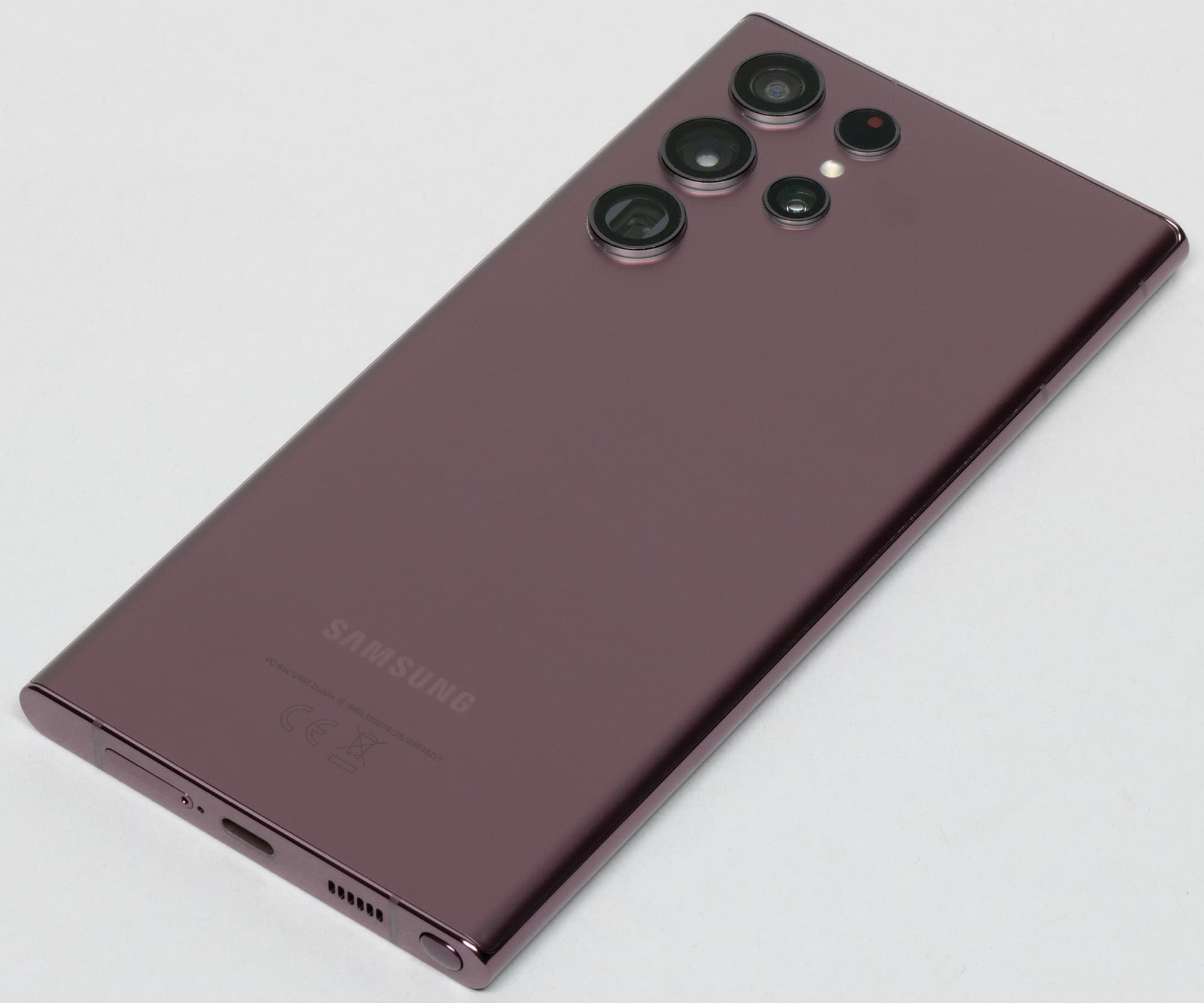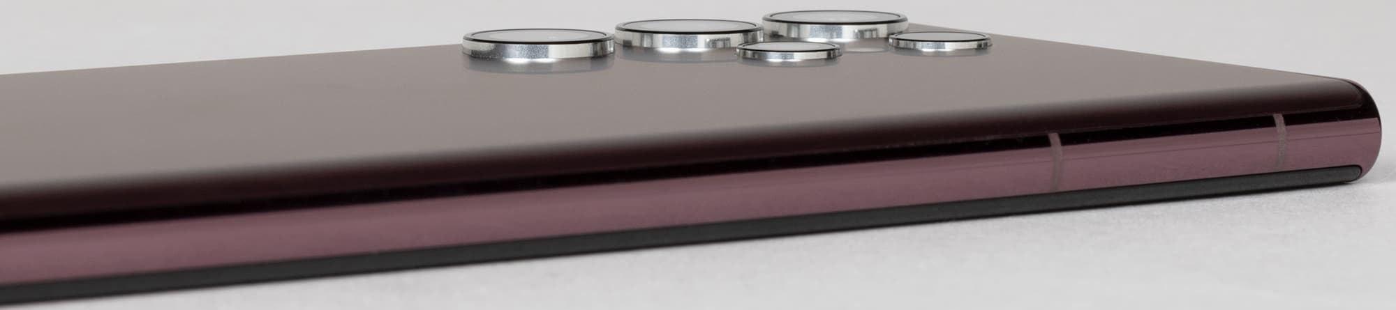 Экран у Samsung Galaxy S22 Ultra заметно темнее (яркость по фотографиям 94 против 98 у Nexus 7) и не имеет выраженного оттенка. Двоение отраженных объектов в экране Samsung Galaxy S22 Ultra очень слабое, это свидетельствует о том, что между слоями экрана нет воздушного промежутка. За счет меньшего числа границ (типа стекло/воздух) с сильно различающимися коэффициентами преломления экраны без воздушного промежутка лучше смотрятся в условиях интенсивной внешней засветки, но вот их ремонт в случае потрескавшегося внешнего стекла обходится гораздо дороже, так как менять приходится экран целиком. На внешней поверхности экрана Samsung Galaxy S22 Ultra есть специальное олеофобное (жироотталкивающее) покрытие (очень эффективное, гораздо лучше, чем у Nexus 7), поэтому следы от пальцев удаляются существенно легче, а появляются с меньшей скоростью, чем в случае обычного стекла.