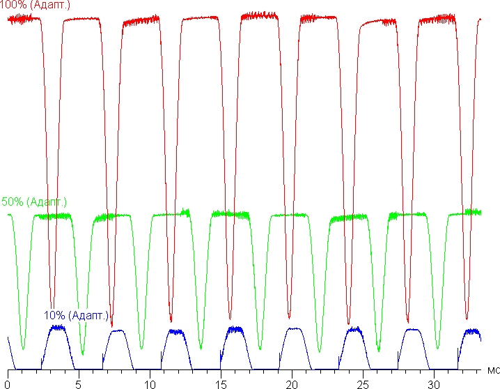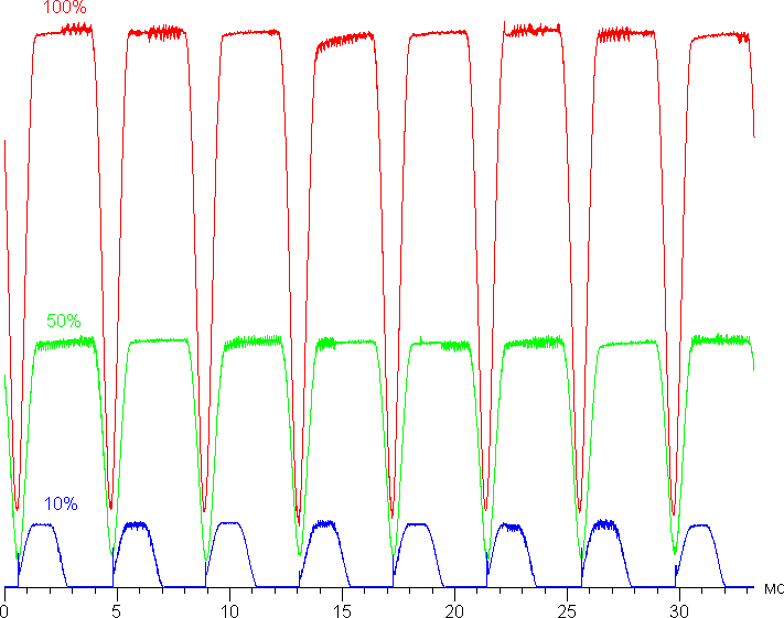 Видно, что на высокой и средней яркости амплитуда модуляции довольно большая, но скважность низкая, в итоге видимого мерцания нет. Однако при сильном понижении яркости появляется модуляция с большой относительной амплитудой и высокой скважностью, ее наличие уже можно увидеть в тесте на присутствие стробоскопического эффекта или просто при быстром движении глаз. В зависимости от индивидуальной чувствительности такое мерцание может вызывать повышенную утомляемость. Впрочем, фаза модуляции различается по площади экрана, поэтому негативный эффект от мерцания снижен.