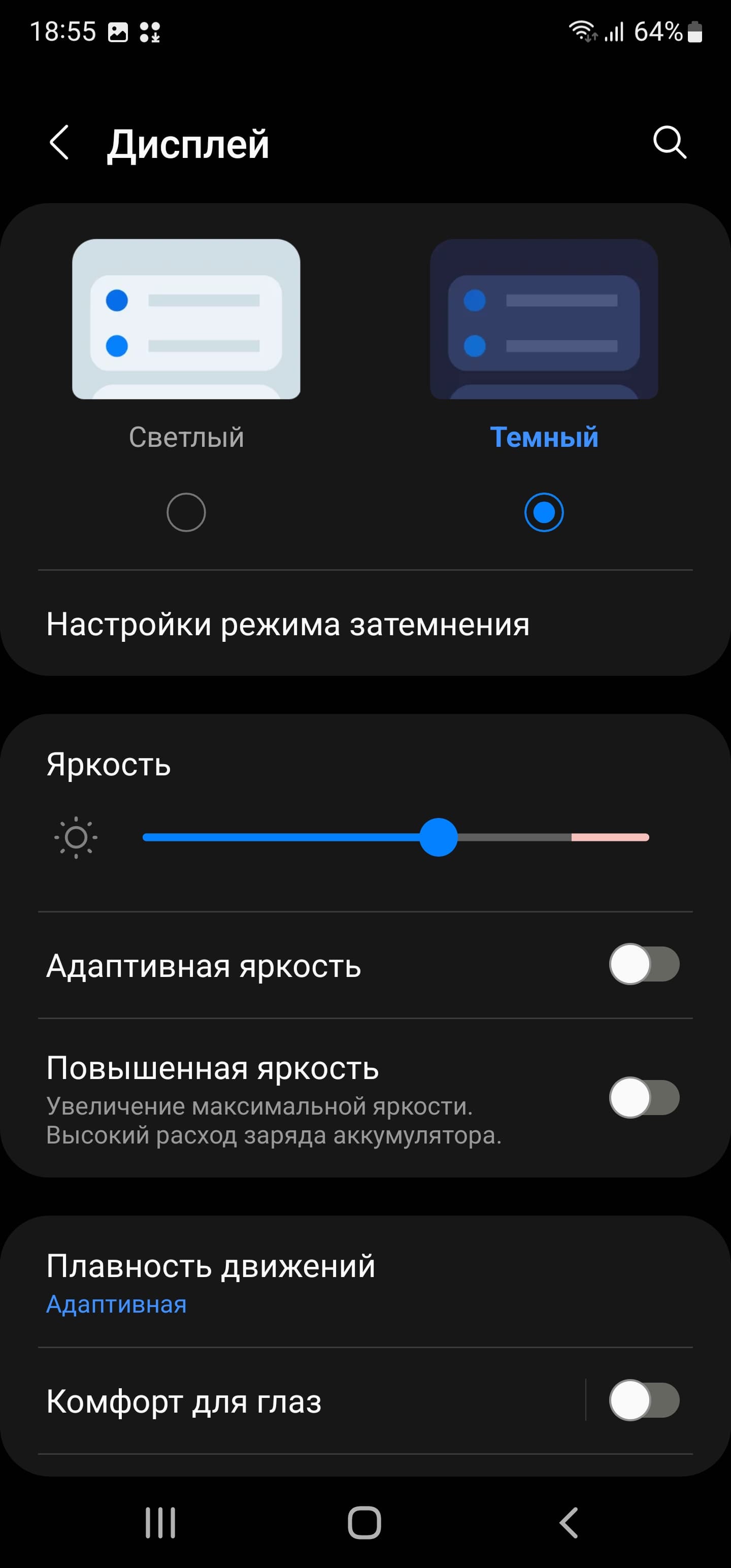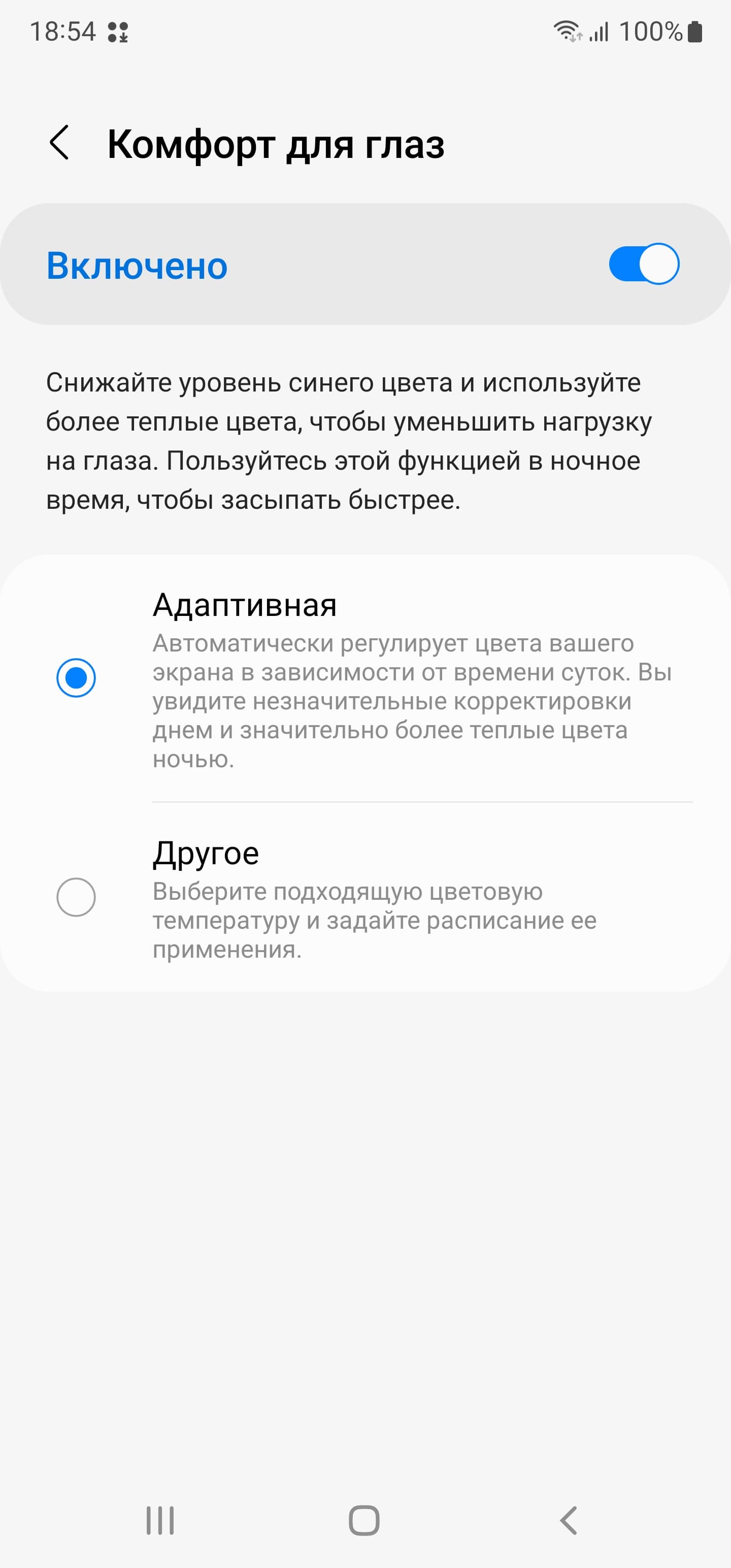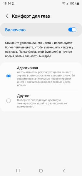 Есть функция Комфорт для глаз, для которой в настройках даже приведено белее-менее корректное описание. Напомним, что, в принципе, яркий свет может приводить к нарушению суточного (циркадного) ритма (см. статью про iPad Pro с дисплеем 9,7 дюйма), но все решается снижением яркости до низкого, но еще комфортного уровня, а искажать цветовой баланс, уменьшая вклад синего, нет абсолютно никакого смысла.