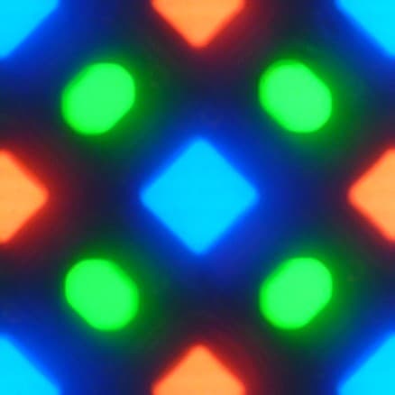 На фрагменте выше можно насчитать 4 зеленых субпикселя, 2 красных (4 половинки) и 2 синих (1 целый и 4 четвертушки), при этом, повторяя эти фрагменты, можно выложить весь экран без разрывов и перехлеста. Для таких матриц компания Samsung ввела наименование PenTile RGBG. Разрешение экрана производитель считает по зеленым субпикселям, по двум другим оно будет в два раза ниже. Присутствуют некоторая неровность контрастных границ и другие артефакты, но из-за очень высокого разрешения они лишь минимально сказываются на качестве изображения.