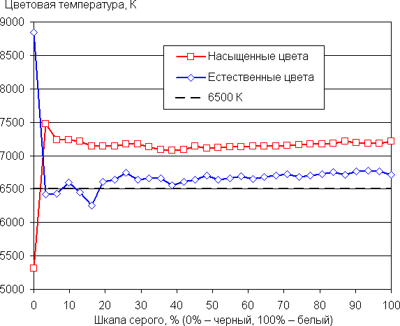 Баланс оттенков на шкале серого хороший. Цветовая температура, особенно после выбора профиля Естественные цвета близка к 6500 К, при этом на значимом участке шкалы серого этот параметр изменяется не очень сильно, что улучшает визуальное восприятие баланса цветов. Отклонение от спектра абсолютно черного тела (ΔE) на большей части шкалы серого остается ниже 3 единиц, что для потребительского устройства считается отличным показателем, и разброс этой характеристики также не очень большой: