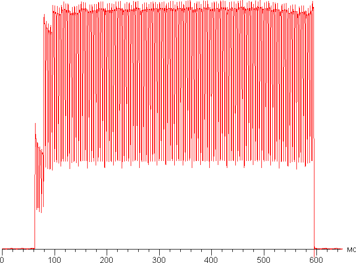 Переключение состояния элементов матрицы выполняется практически мгновенно, но на фронте включения может присутствовать ступенька(и) шириной примерно 17 мс (частота обновления 60 Гц) или 8,3 мс (частота обновления 120 Гц). Например, так выглядит зависимость яркости от времени при переходе от черного к белому и обратно (режим с частотой обновления 60 Гц):