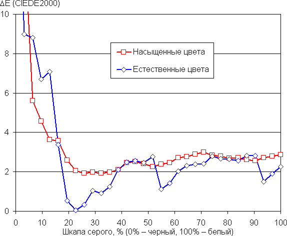 (Самые темные области шкалы серого в большинстве случаев можно не учитывать, так как там баланс цветов не имеет большого значения, да и погрешность измерений цветовых характеристик на низкой яркости большая.)
