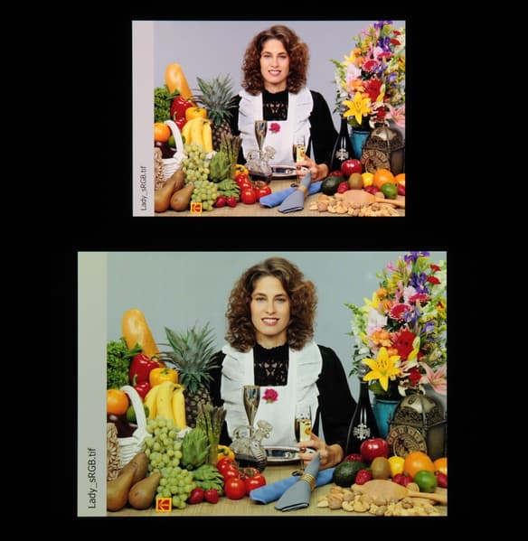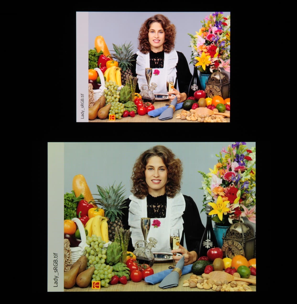 Отметим, что на экранах с широким цветовым охватом (без соответствующей коррекции) цвета́ обычных изображений, оптимизированных для устройств sRGB, выглядят неестественно насыщенными. Отсюда и рекомендация: в большинстве случаев смотреть кино, фотографии и все естественное лучше при выборе профиля Естественные цвета, и только если фотография или видеоматериал сделаны с охватом DCI, принятым в цифровом кинематографе, то имеет смысл переключить профиль на Насыщенные цвета.
