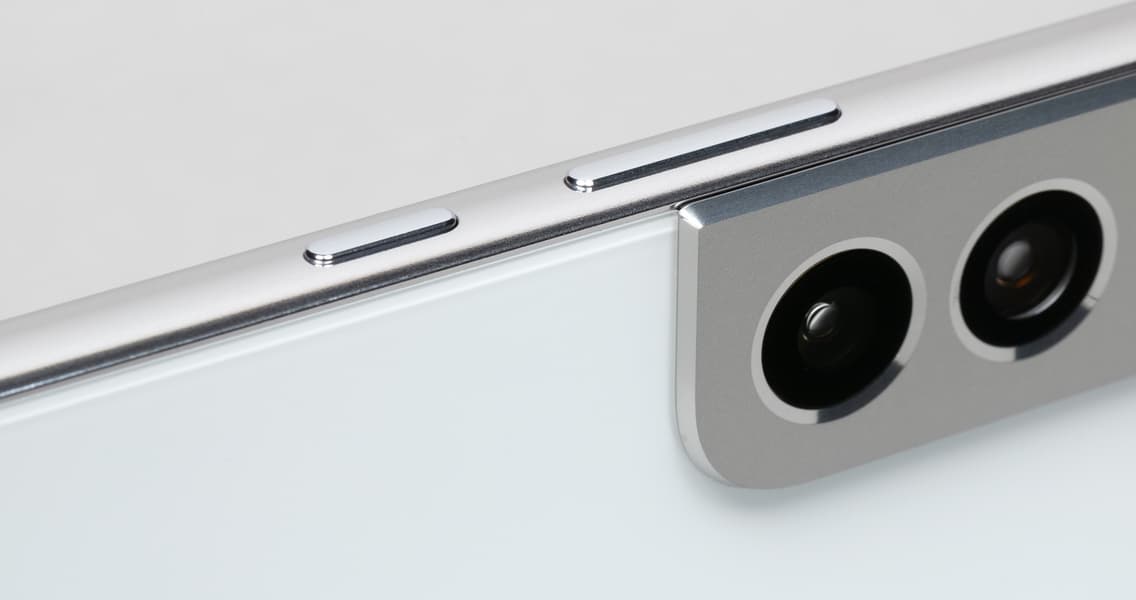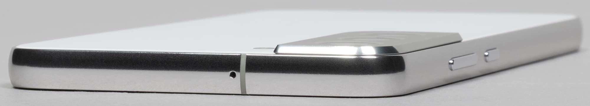 Лицевая поверхность экрана выполнена в виде стеклянной пластины с зеркально-гладкой поверхностью, устойчивой к появлению царапин. Судя по отражению объектов, антибликовые свойства экрана лучше, чем у экрана Google Nexus 7 (2013) (далее просто Nexus 7). Для наглядности приведем фотографию, на которой в выключенных экранах отражается белая поверхность (слева — Nexus 7, справа — Samsung Galaxy S22+, далее их можно различать по размеру):
