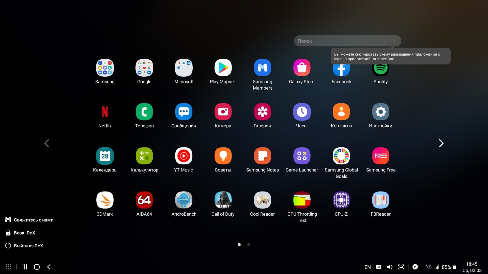 Оптимизированные для Samsung DeX приложения можно установить из фирменного магазина. Управляющая панель в нижней части экрана убирается при выводе изображения на весь экран (например, при воспроизведении видео). Вывод на монитор осуществляется в истинном разрешении 1920 на 1080 пикселей и точка в точку с кадровой частотой 60 Гц. Отметим, что одновременно с выводом изображения и звука можно по USB или по Bluetooth подключать к смартфону мышь и клавиатуру, превращая его в основу для рабочего места. Кроме того, читаются подключенные к адаптеру USB-накопители. Для физической клавиатуры поддерживаются переключение языка и ряд горячих сочетаний клавиш. Поддерживается также подключение к проводной сети на скорости 1 Гбит/с.