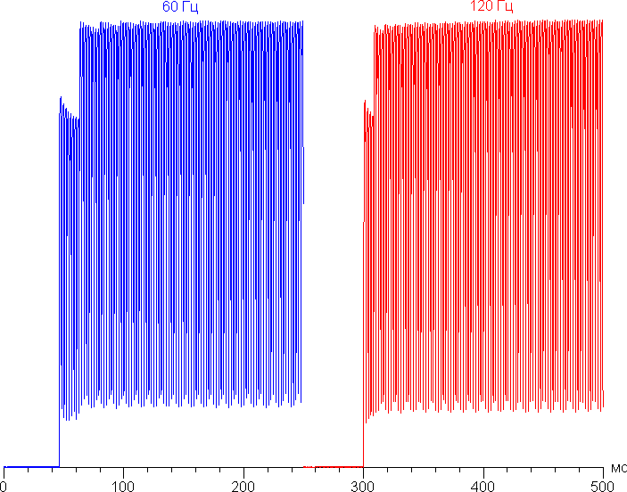 Действительно, в режиме 120 Гц плавность прокрутки повышается. Посмотрим, изменится ли при этом характер модуляции: