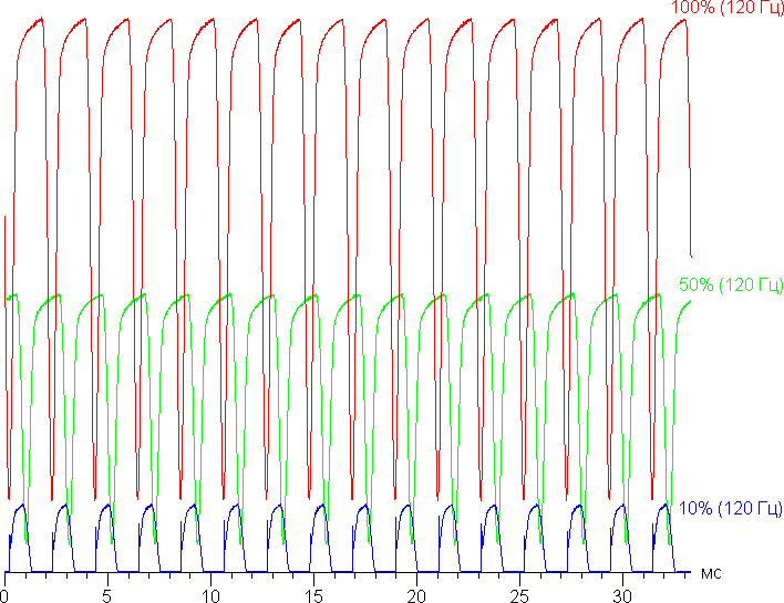 Видно, что на высокой и средней яркости амплитуда модуляции довольно большая, но скважность низкая, в итоге видимого мерцания нет. Однако при сильном понижении яркости появляется модуляция с большой относительной амплитудой и высокой скважностью, ее наличие уже можно увидеть в тесте на присутствие стробоскопического эффекта или просто при быстром движении глаз. В зависимости от индивидуальной чувствительности такое мерцание может вызывать повышенную утомляемость. Впрочем, фаза модуляции различается по площади экрана, а частота довольно высокая, поэтому негативный эффект от мерцания снижен.