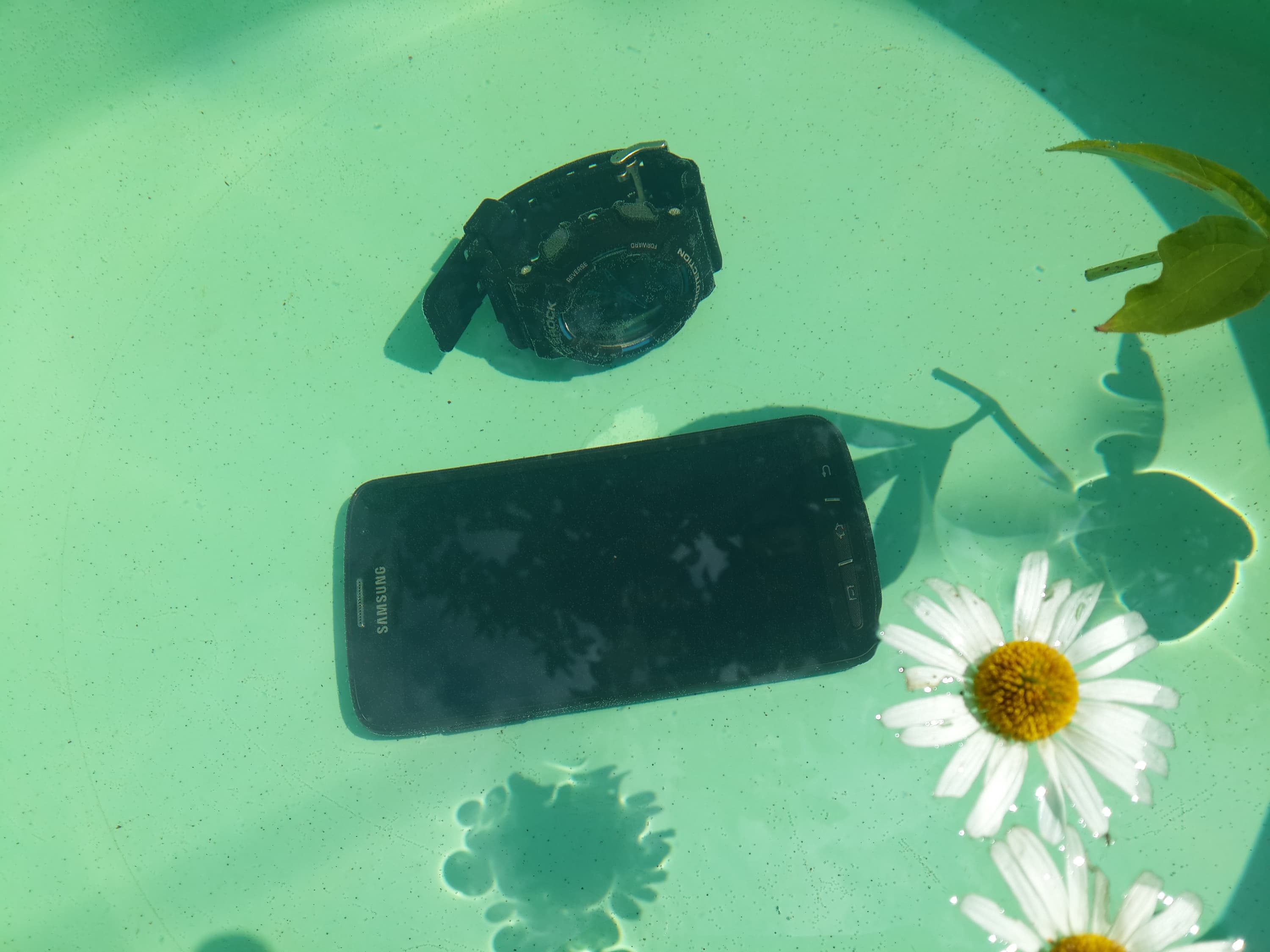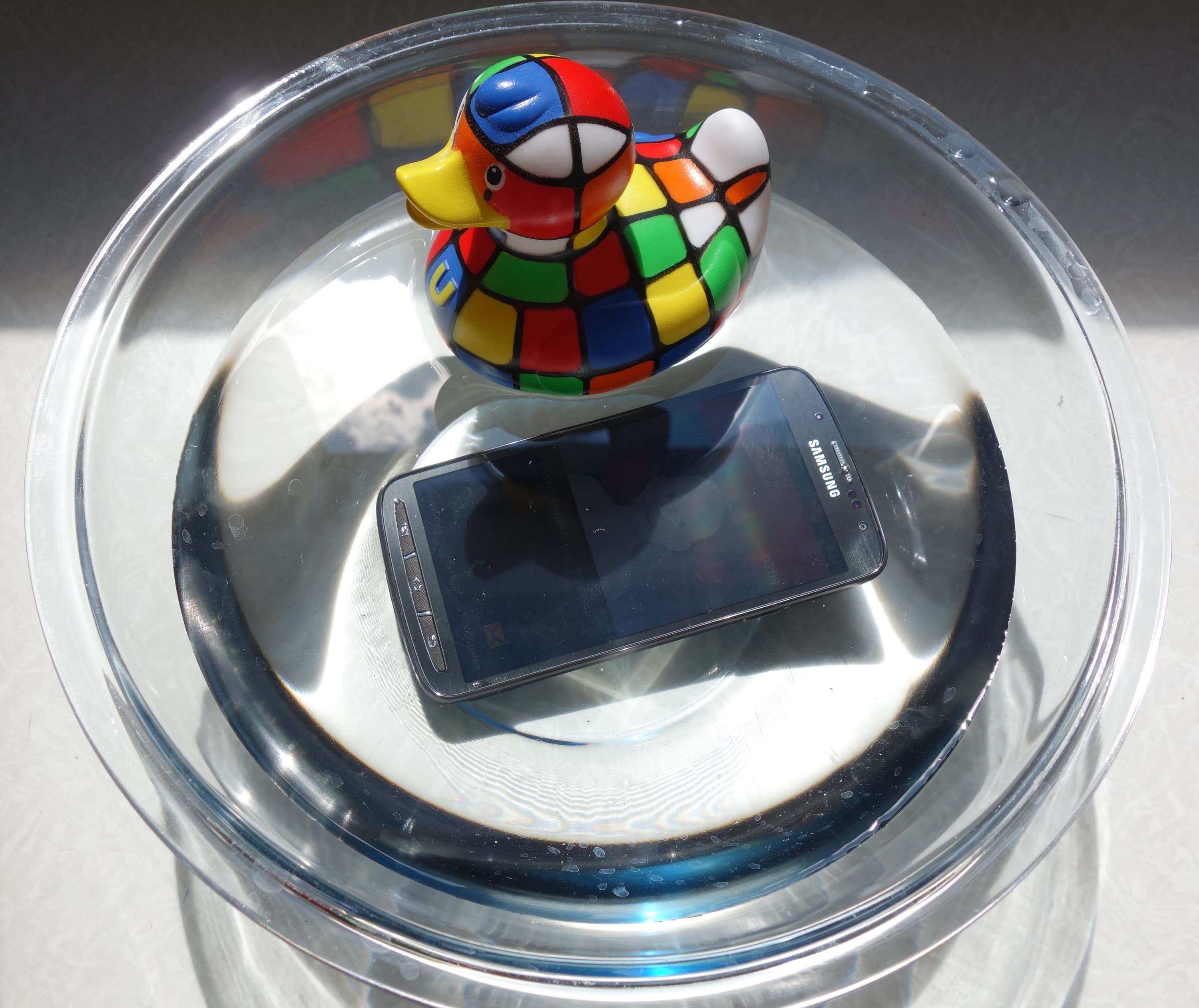 К сожалению, присланный к нам в редакцию экземпляр Samsung Galaxy S4 Active оказался на поверку вовсе не финальным, а всего лишь предрелизным демонстрационным образцом, не предназначенным для настоящего тестирования его свойств защиты. Однако мы узнали об этом гораздо позже — уже после того, как хорошенько «искупали» нашего подопечного в тазу. На этот раз проверка была тем более актуальна, потому что у аппарата среди прочих возможностей заявлен режим подводной съемки — уникальный режим «Вода», при котором управление камерой автоматически переключается на клавишу громкости: ведь под водой сенсорный экран становится нечувствителен к прикосновениям.