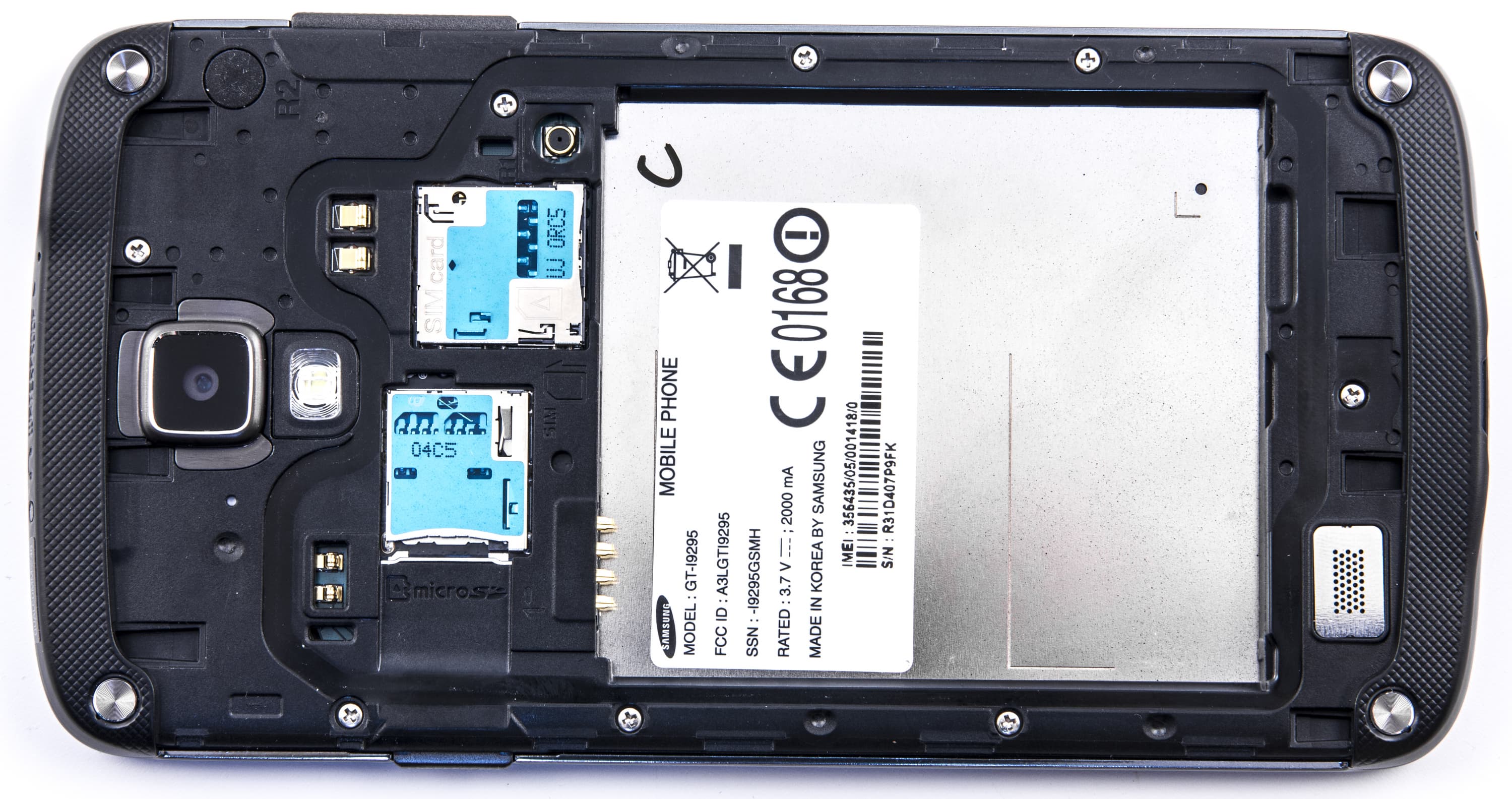 Материалы корпуса Samsung Galaxy S4 Active — сплошной пластик, металла здесь нет, за исключением декоративных вставок вокруг окошка тыльной камеры и на месте крепления винтов. Металлизированный ободок, проходящий по всему периметру устройства, также выполнен не из металла, а из пластика с покрытием, напоминающим вороненую оружейную сталь.