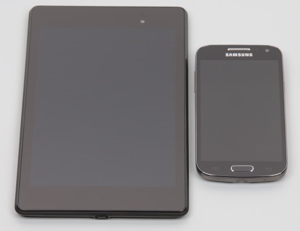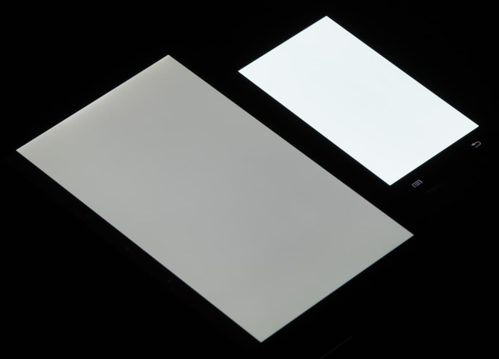 Лицевая поверхность экрана выполнена в виде стеклянной пластины с зеркально-гладкой поверхностью, устойчивой к появлению царапин. Судя по яркости отраженных объектов, имеется очень эффективный антибликовый фильтр, превосходящий по снижению яркости отражения фильтр экрана Google Nexus 7 (2013) (далее просто Nexus 7). Для наглядности приведем фотографию, на которой в выключенных экранах отражается белая поверхность (слева — Nexus 7, справа — Samsung Galaxy S4 Mini, далее их можно различать по размеру):