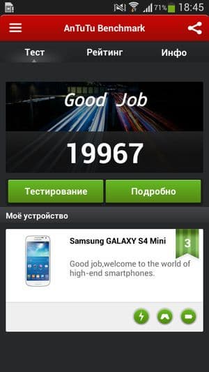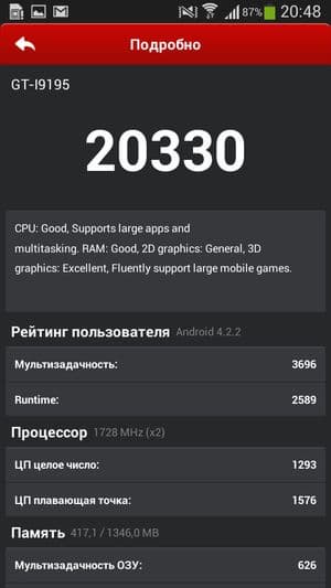 В целом, по результатам всех тестов смартфон Samsung Galaxy S4 mini Black Edition можно смело отнести к разряду аппаратов со средней (даже чуть выше среднего) производительностью. На данный момент мощности данного смартфона должно хватать для выполнения практически любых задач, которые могут поставить какие-либо игры или другие приложения из Google Play Store.