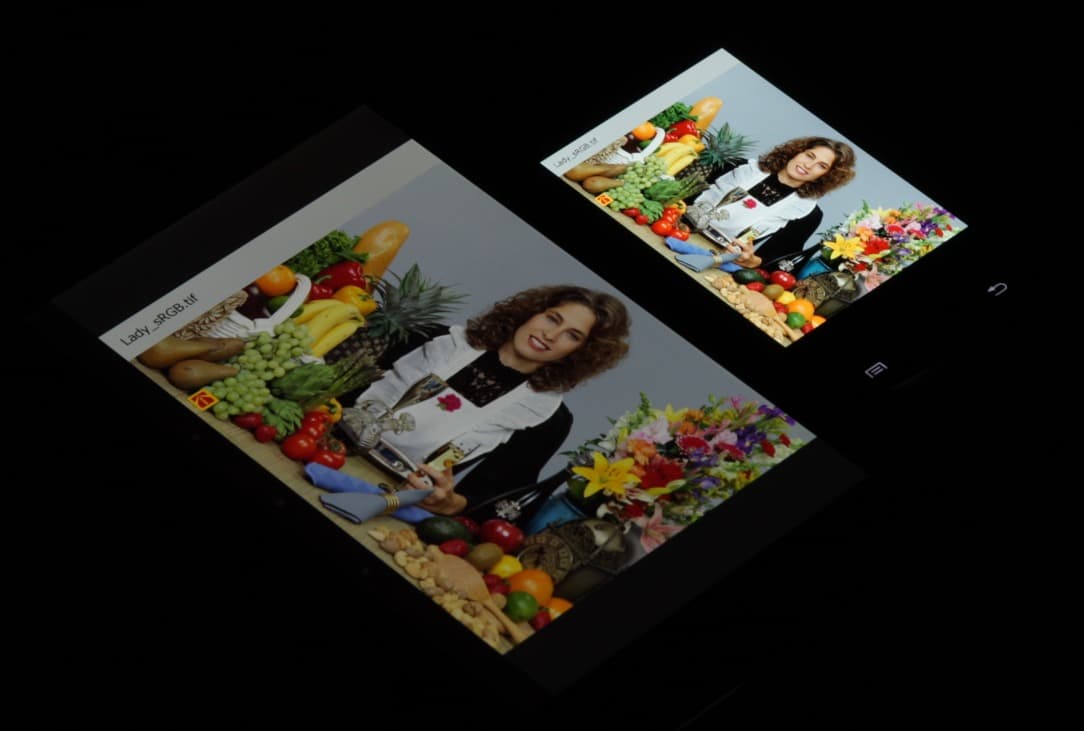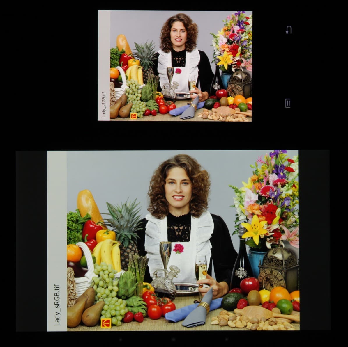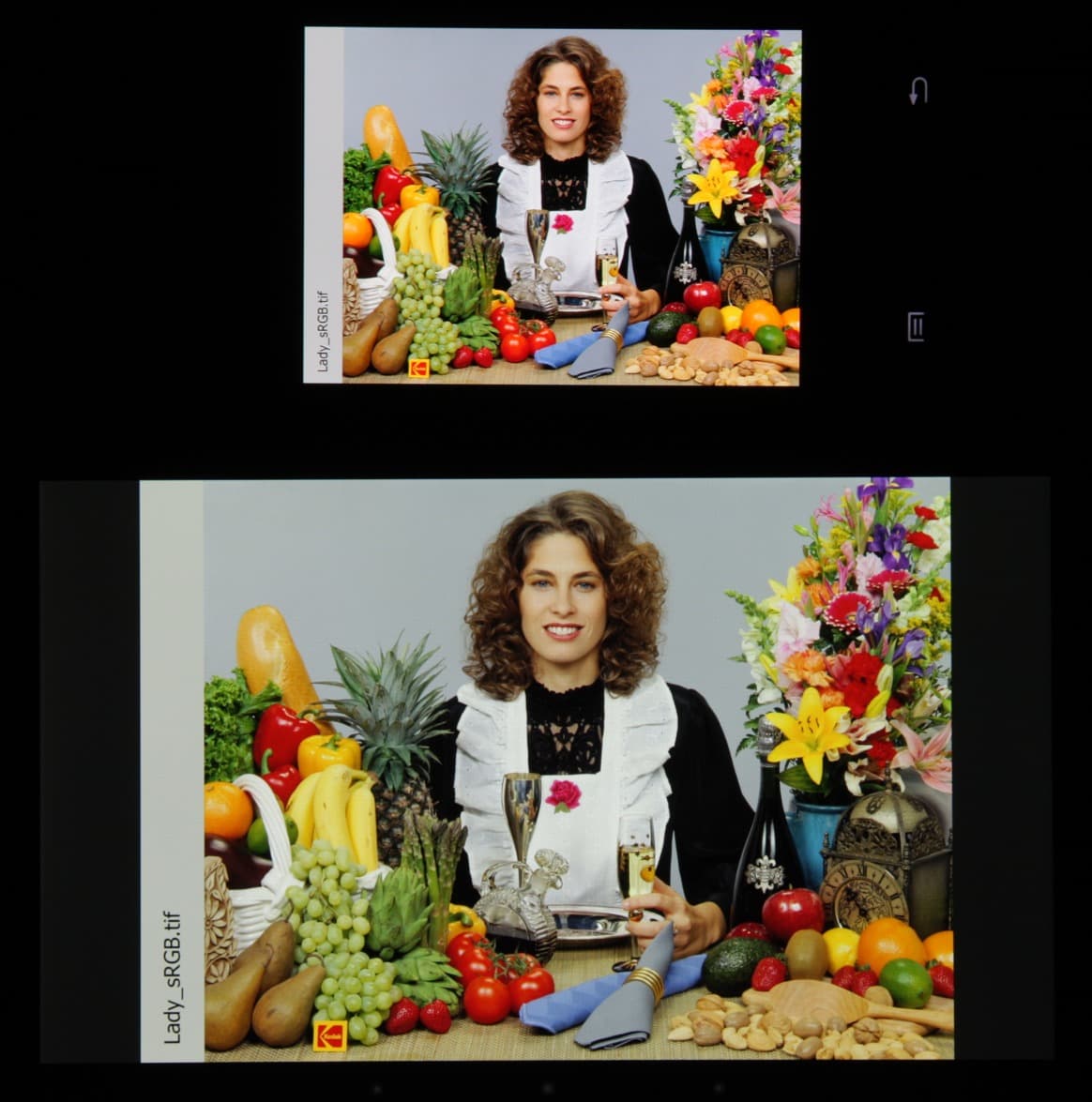 Яркость под углом у обоих экранов заметно уменьшилась (чтобы избежать сильного затемнения, выдержка увеличена в два раза в сравнении с предыдущими двумя фотографиями), но в случае Samsung падение яркости выражено гораздо меньше. И тестовая картинка: