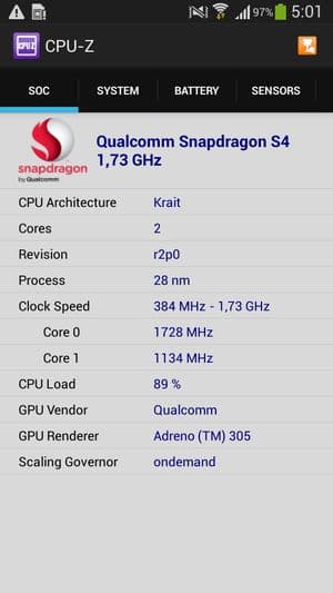 - SoC Qualcomm Snapdragon 400 (MSM8960), 1,7 ГГц, 2 ядра Krait 300
