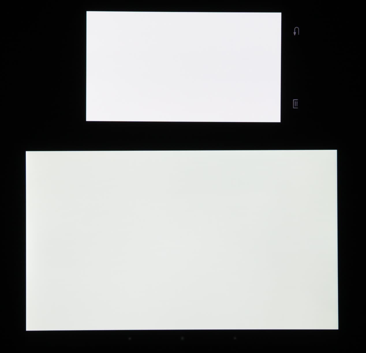Экран характеризуется великолепными углами обзора. Правда, белый цвет при отклонении на относительно большие углы приобретает легкий сине-зеленый оттенок, но черный цвет остается просто черным под любыми углами (хотя отражение от ярких объектов имеет синеватый ореол, больше вытянутый по горизонтали, из-за чего на свету черные участки могут слегка высветляться и приобретать «металлический» оттенок). Черный цвет здесь настолько черный, что параметр контрастности в данном случае просто неприменим. При перпендикулярном взгляде равномерность белого поля отличная. Для сравнения приведем фотографии, на которых на экраны Samsung Galaxy S4 Mini и второго участника сравнения выведены одинаковые изображения, при этом яркость экранов установлена примерно на 200 кд/м². Перпендикулярно к экранам белое поле: