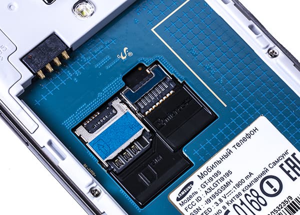 Под крышкой скрываются батарейный отсек и слоты для карточек (SIM-карты и карты памяти), но добраться до них можно, лишь отсоединив аккумулятор. SIM-карта здесь используется формата Micro-SIM, карты памяти (microSD) поддерживаются до 64 ГБ.