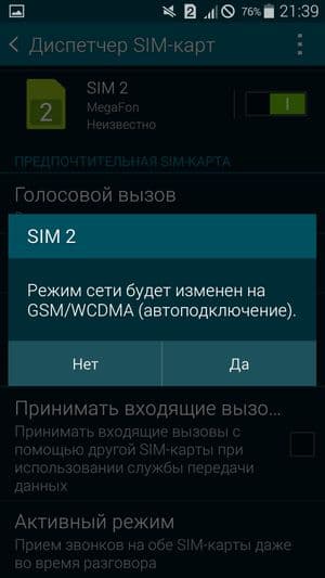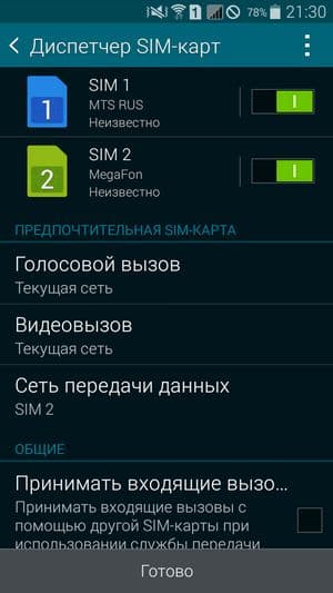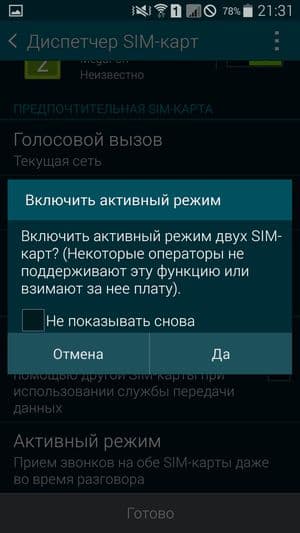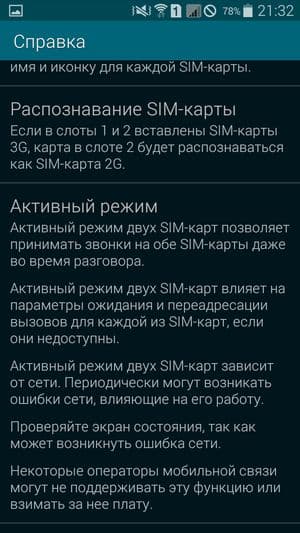 Смартфон поддерживает работу с двумя SIM-картами, и в целом работа с ними в меню организована по знакомому принципу: можно любую из SIM-карт назначить основной для организации голосовых звонков, передачи данных или отправки SMS-сообщений. При наборе номера также можно выбрать желаемую карту, вызвав контекстное меню из меню уведомлений. С сетями 3G может работать SIM-карта в любом слоте, однако одновременно в этом режиме может работать лишь одна из карт (вторая будет работать только в 2G). Радиомодуль в аппарате установлен только один, однако здесь реализован стандартный для всех моделей Samsung Duos так называемый «Активный режим», который позволяет принять вызов на вторую SIM-карту при занятой первой. Реализуется это за счет установки перекрестной переадресации номеров обеих карточек друг на друга. Работа активного режима двух SIM-карт основана на таких услугах оператора сотовой связи, как переадресация вызова и ожидание/удержание вызова. После включения режима аппарат предлагает вручную ввести два номера, которые будут переадресованы друг на друга. Для работы функции услуга переадресации обязательно должна быть активирована на обеих SIM-картах. Подробнее о реализации «Активного режима» можно прочитать на сайте производителя.